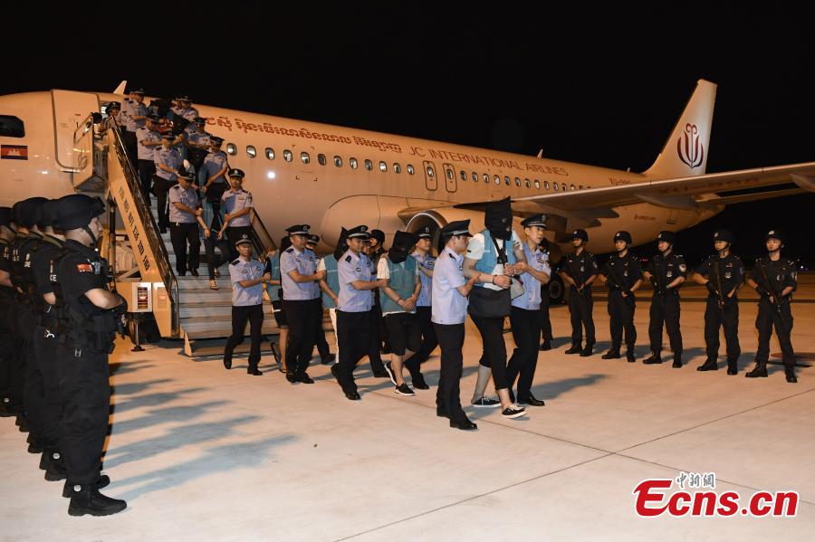 Suspects in telecoms scams are brought back to China from Cambodia at Chengdu Shuangliu International Airport in Chengdu, capital of southwest China's Sichuan Province, Aug. 24, 2017. Cambodia on Thursday deported 122 Chinese nationals, including 16 women, suspected of operating a telecoms scam to extort money from victims in China, a senior police official said. (Photo: China News Service/An Yuan)