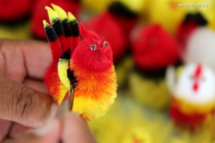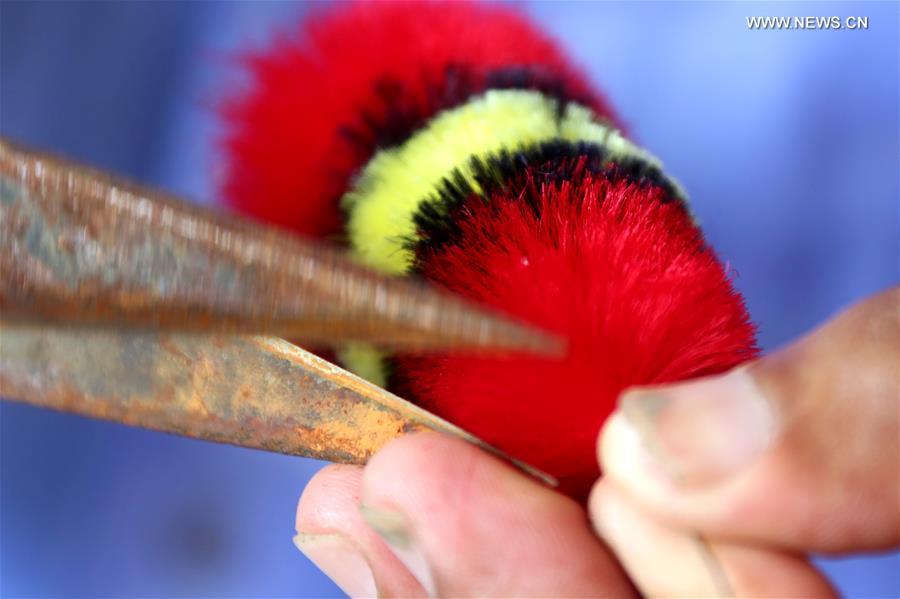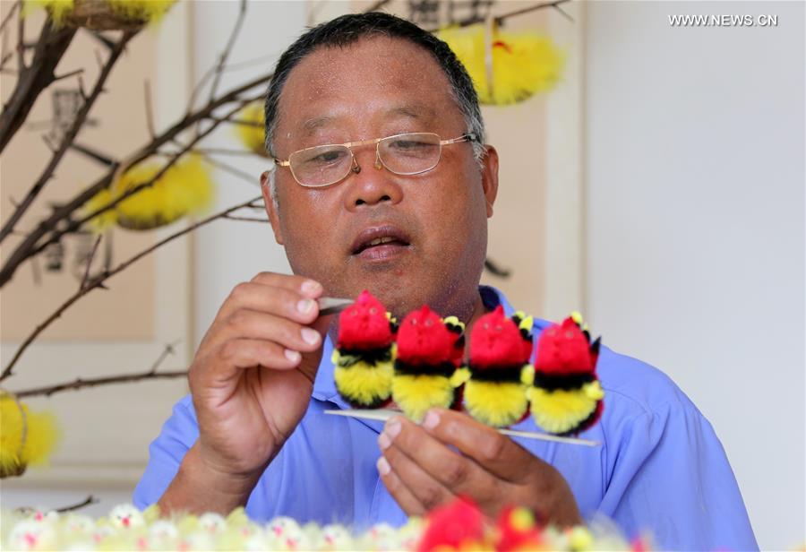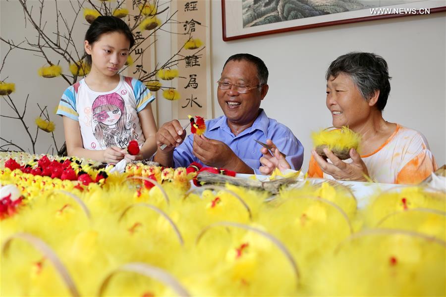 Inheritor of intangible cultural heritage Cui Yongxin (C) makes a velvet bird at his workshop at Laopo Village of Zaozhuang City, east China's Shandong Province, Aug. 24, 2017. Velvet bird handicraft has a history of over 100 years and it was listed as the intangible cultural heritage by Zaozhuang City. Made with flexible copper wires and colorful silk, the velvet products can be made in many forms including birds. (Xinhua/Sun Zhongzhe)