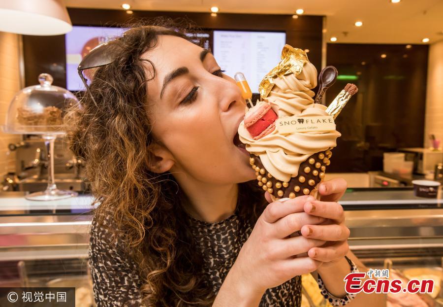 With a price of 99 pound , the Billionaire’s Soft Serve, produced by the ice cream maker Snowflake, is claiming to be Britain’s most expensive ice cream, complete with a gold leaf-coated flake and spoon. Each wafer cone — dipped in dark chocolate and coated in golden pearls — contains a dollop as big as your head and weighs in at 350g. Two hands are needed to hold it. Snowflake founder and chief executive Asad Khan said the ice cream was “not really for billionaires” but for “ordinary Londoners to share as a fun experience”. (Photo/Agencies)
