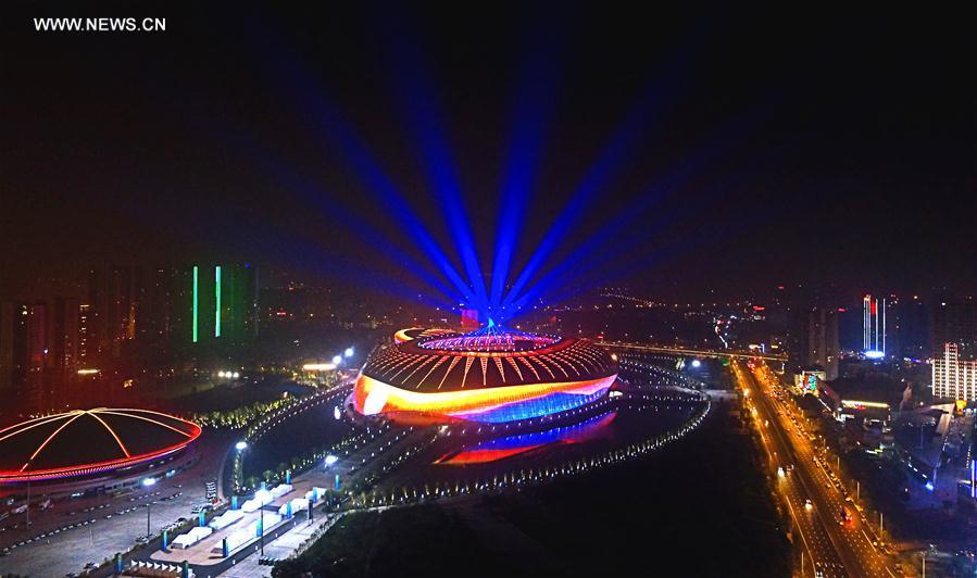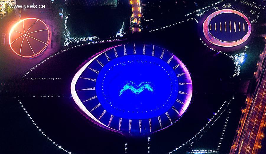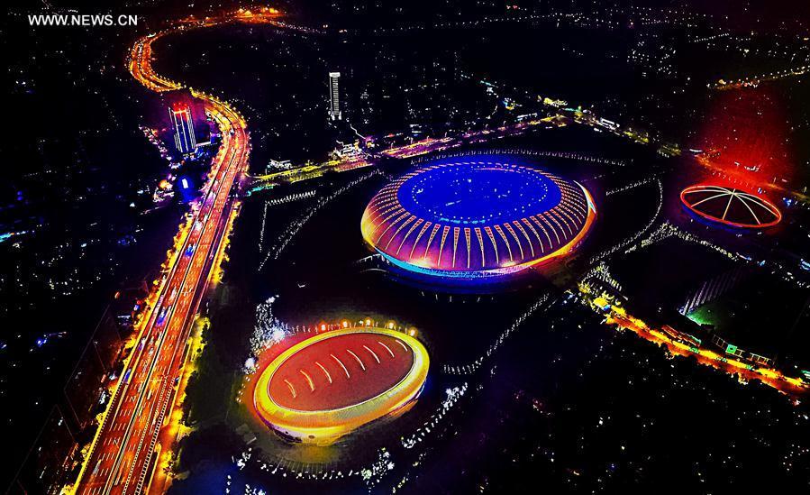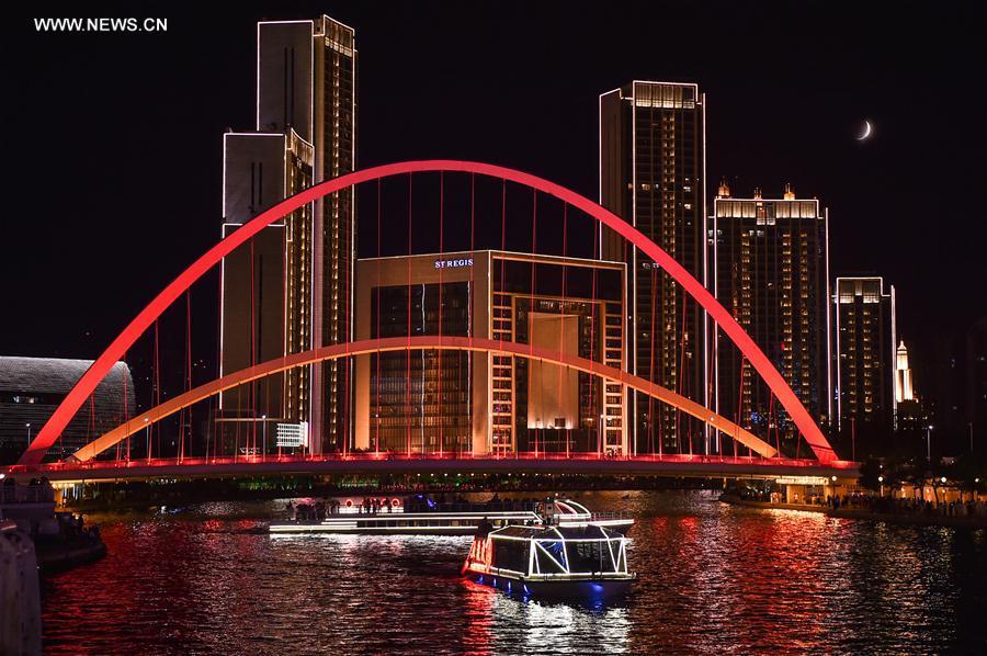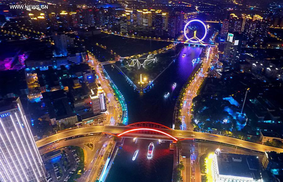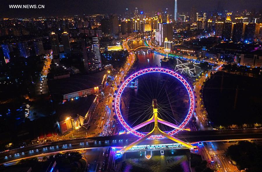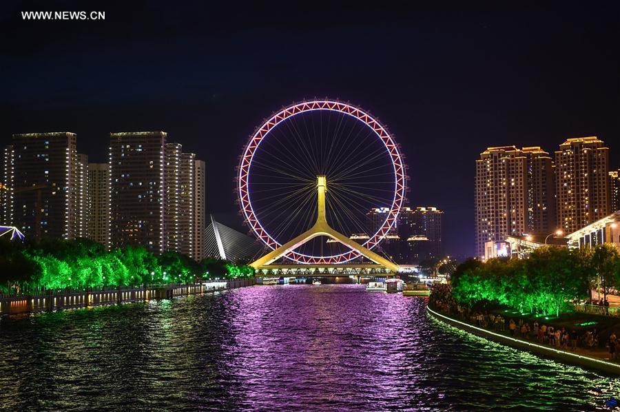 Photo taken on Aug. 25, 2017 shows the night scene of the Tianjin Eye in north China's Tianjin Municipality. The 13th Chinese National Games will open on Aug. 27 in Tianjin. (Xinhua/Li Bo)