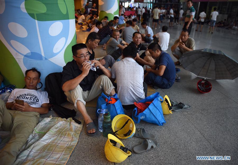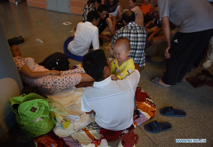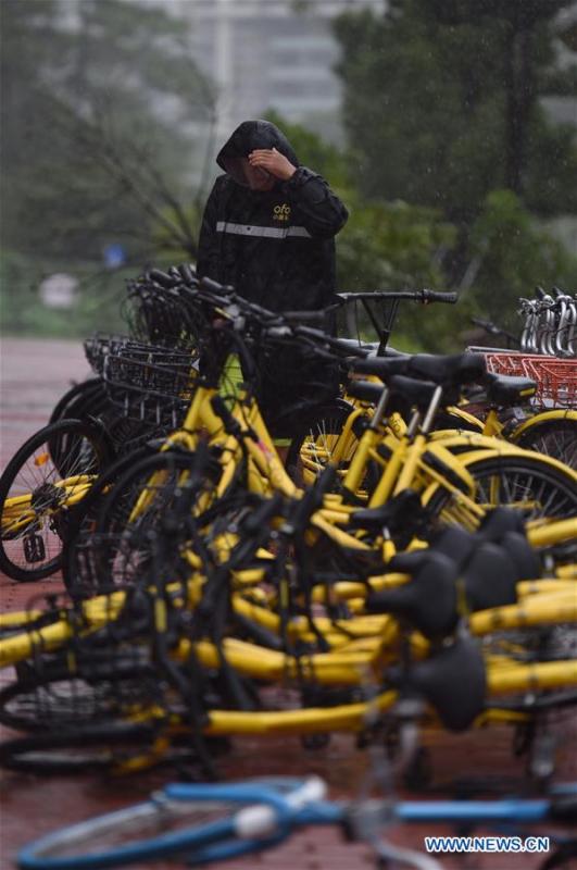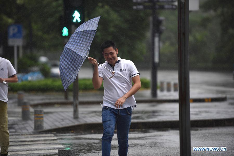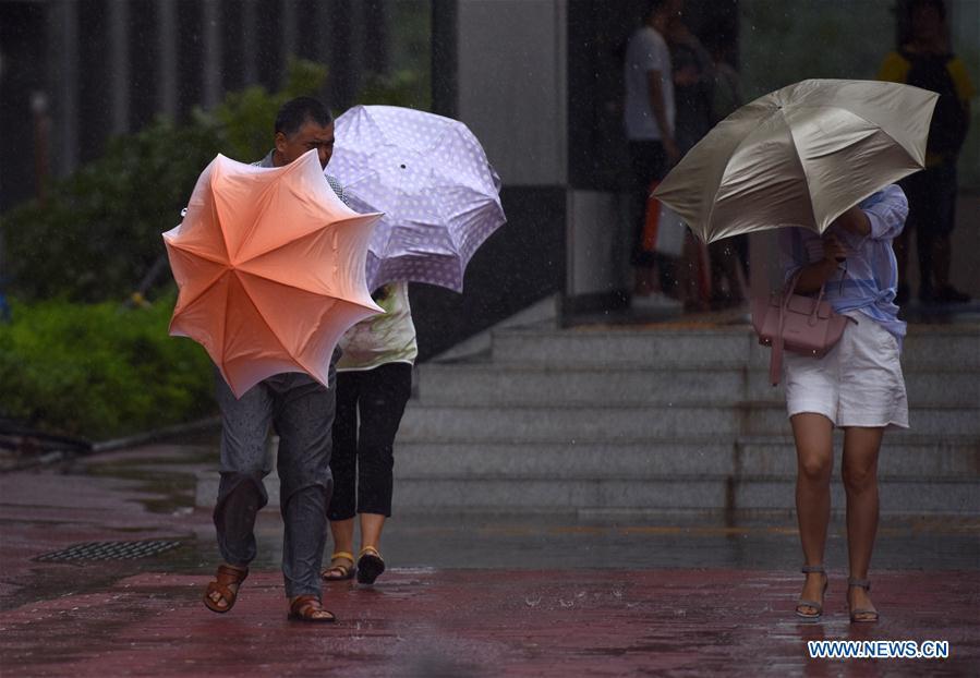 People walk against strong wind and rain in Shenzhen, south China's Guangdong Province, Aug. 27, 2017. Pakhar, the 14th typhoon this year, landed around 9 a.m. (0100 GMT) Sunday in the city of Taishan in Guangdong, bringing gales of up to 33 meters per second. (Xinhua/Mao Siqian)