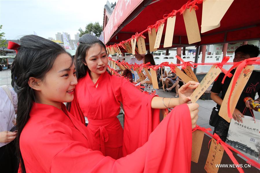Han Chinese clothing lovers take part in a Qixi Festival cultural activity in Weifang City, east China's Shandong Province, Aug. 27, 2017. Dozens of Han Chinese clothing lovers gathered together in Weifang on Sunday to greet the upcoming Qixi festival, or Chinese Valentine's Day, which falls on Aug. 28 this year. (Xinhua/Zhang Chi)