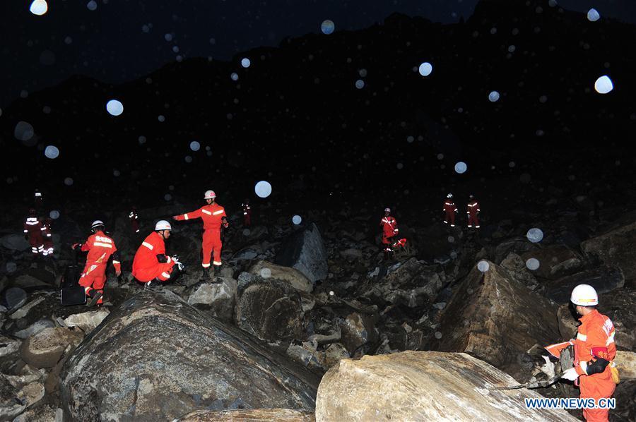 Rescuers work at the site of the landslide in Zhangjiawan Township of Nayong County in southwest China's Guizhou Province, Aug. 28, 2017. The landslide occurred at about 10:40 a.m. on Aug. 28. Three people have died, seven injured and another 32 are missing until 8 p.m. Over 2,000 people, including police, firefighters and medical staff are at the scene and more than 80 emergency vehicles, 20 life detectors, 17 digging machines and 8 drones are involved in the rescue work. (Xinhua/Tao Liang)