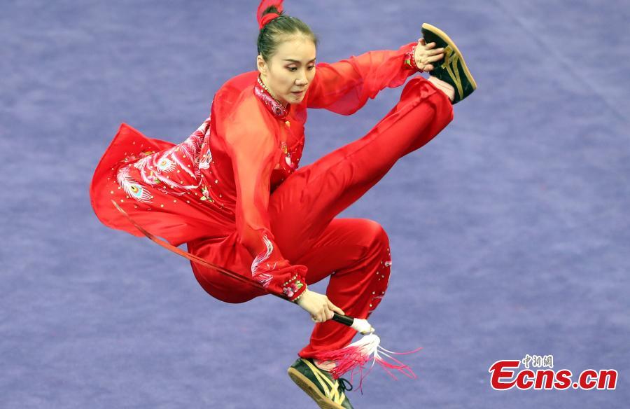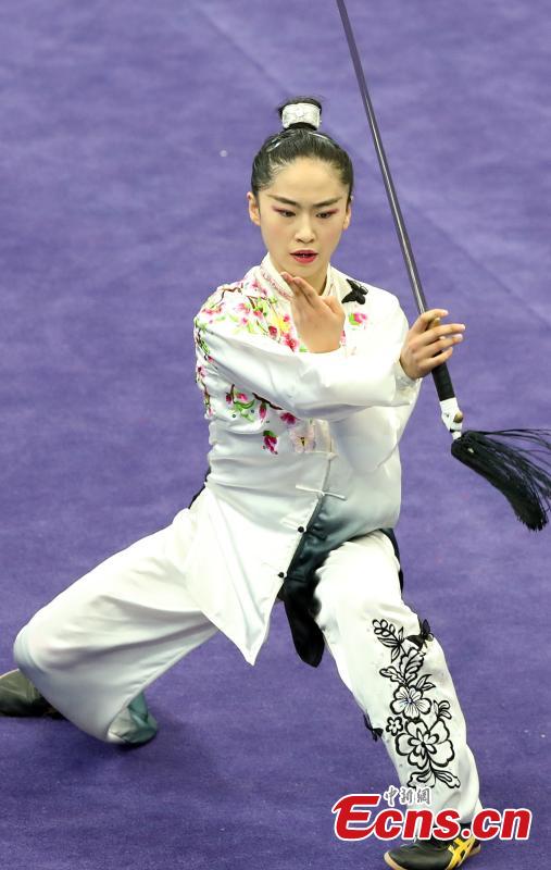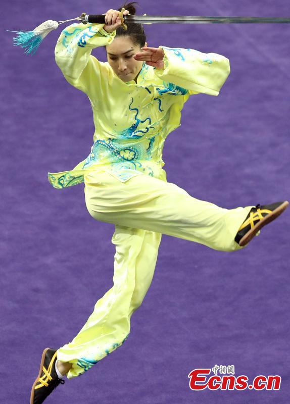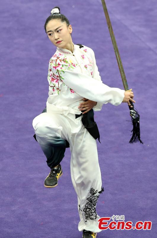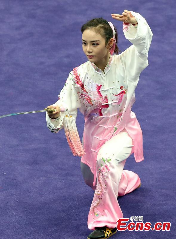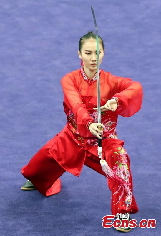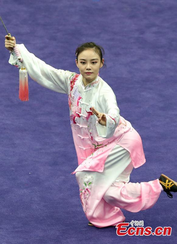 Liang Biyong from Guangdong Province performs Tai Chi with a sword at the 13th Chinese National Games in Tianjin, Aug 28, 2017. The event has attracted a total of 12,721 athletes to participate in 417 events across 33 sports, plus 7,620 amateurs in 126 events of 19 mass programs. (Photo: China News Service/Zhang Yu)