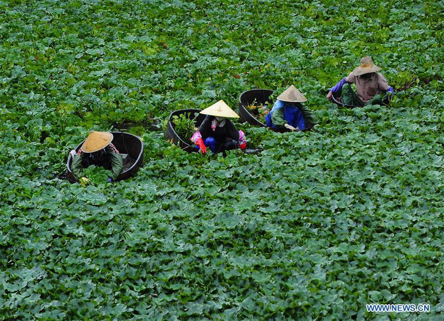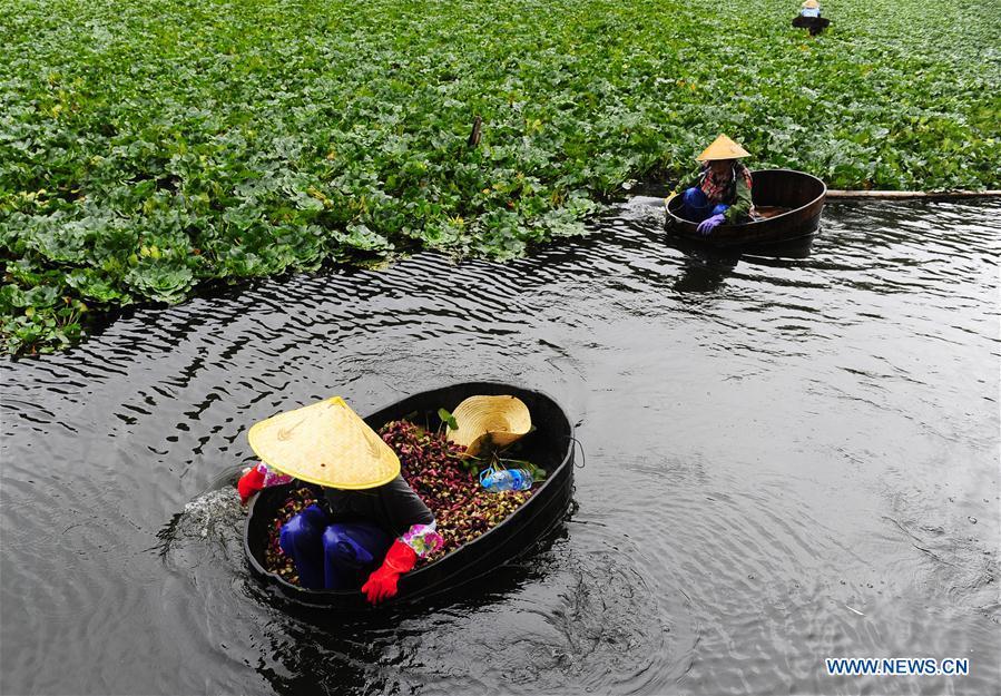 Farmers collect water chestnuts in a lake in Wuxi, east China's Jiangsu Province, Aug. 29, 2017. The triangular spiky water plant is in its harvest season when the Autumn falls in the middle and lower reaches of the Yangtze River. (Xinhua/Huan Yueliang)