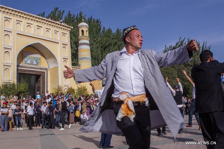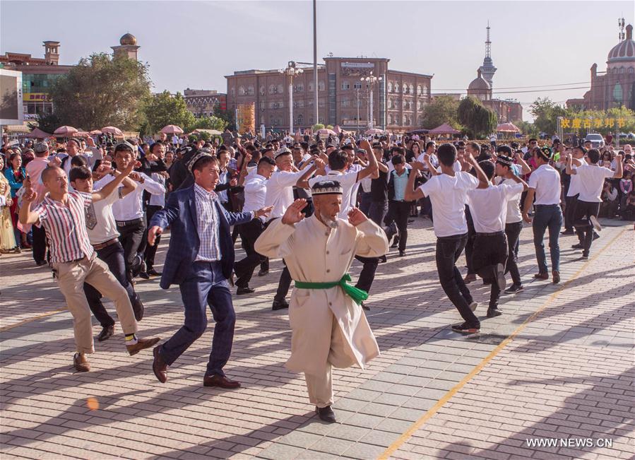People dance to observe Eid al Adha, known in China as Corban Festival, one of Islam's most important holidays, in Kashgar, northwest China's Xinjiang, Sept. 1, 2017. (Xinhua/Cen Yunpeng)