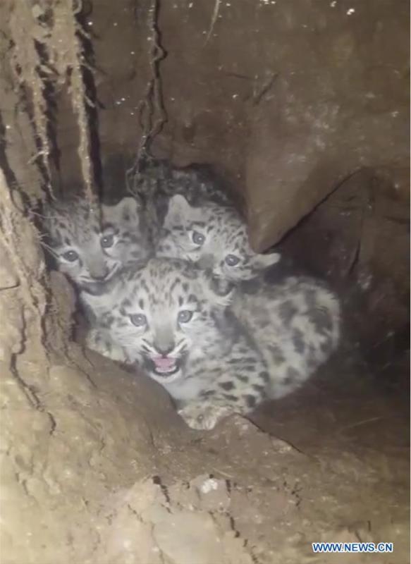 The video grab taken on Sept. 1, 2017 shows three snow leopard cubs inside a small cave in Shiqu County of southwest China's Sichuan Province. On Friday, a villager in Aoyi Village, Shiqu County saw a dead bharal when pasturing cattle and found three snow leopard cubs of three to four months old in a cave not far from the bharal's body. A forest ranger was dispatched to film the leopards in the afternoon. The area belongs to a provincial nature reserve, a main habitat for snow leopards. Infrared cameras have captured snow leopards for more than 20 times since 2013. (Photo/Xinhua)