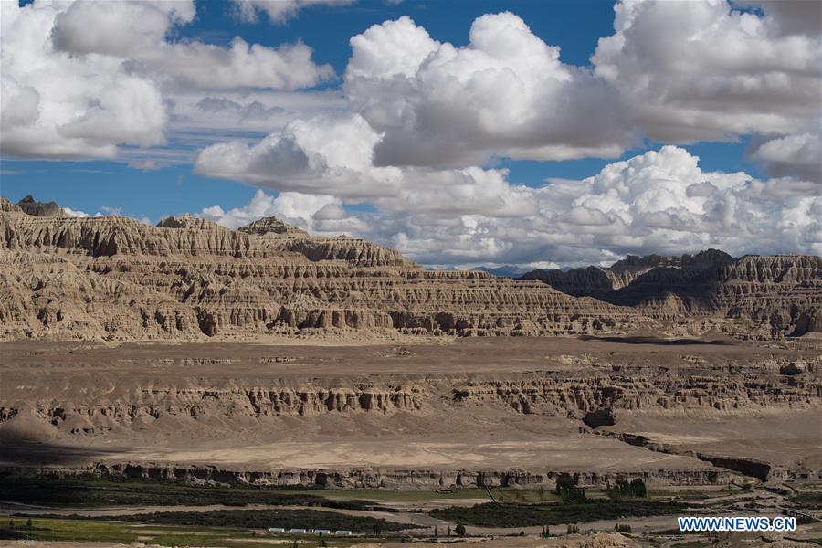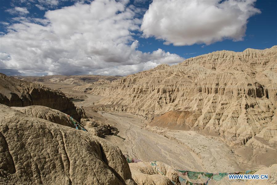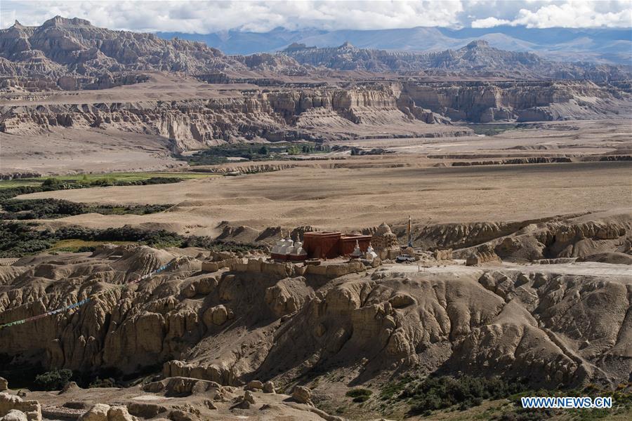 Photo taken on Aug. 31, 2017 shows a temple in the valley of the Zanda soil forest landscape in Zanda County of Ali prefecture, southwest China's Tibet Autonomous Region. The Zanda soil forest landscape, the former lake sediment in the ancient times, resulted from the geographic changes during the Himalayan orogeny, forming an unique and magnificent scenery. (Xinhua/Liu Dongjun)