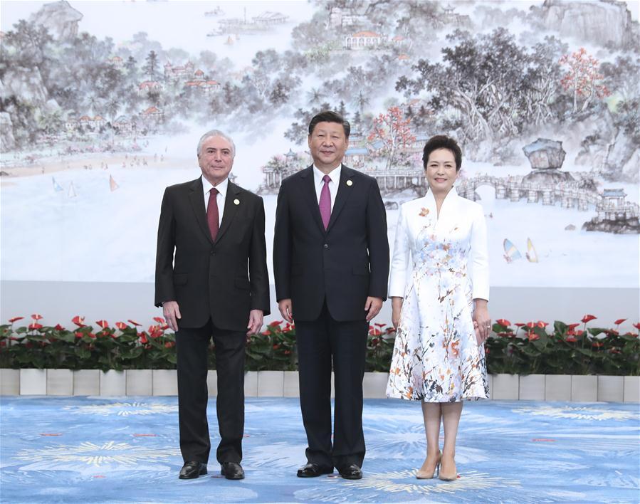 Chinese President Xi Jinping and his wife Peng Liyuan welcome Thai Prime Minister Prayut Chan-o-cha and his wife before a banquet for those attending the ninth BRICS summit and the Dialogue of Emerging Market and Developing Countries in Xiamen, southeast China's Fujian Province, Sept. 4, 2017. (Xinhua/Ma Zhancheng)