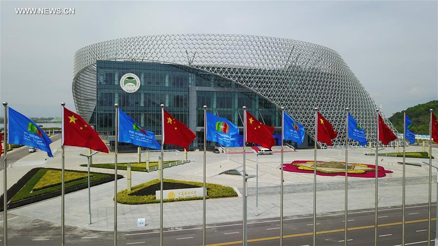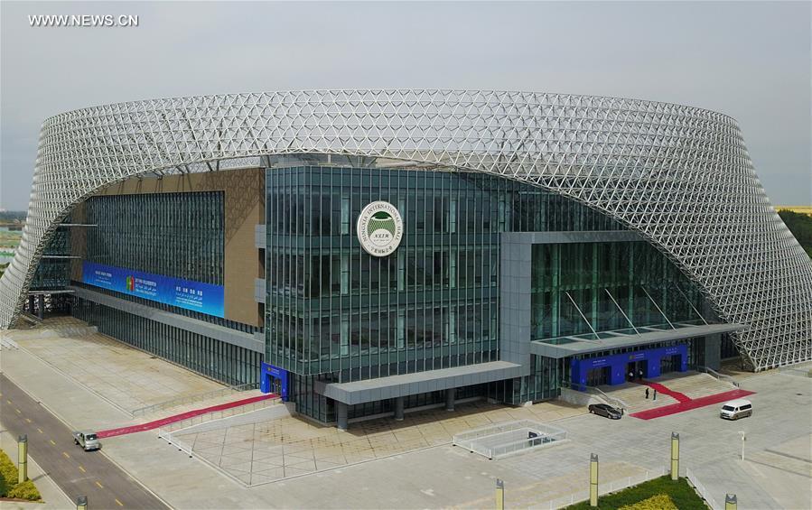 Aerial photo taken on Sept. 5, 2017 shows the Ningxia International Hall, where the China-Arab States Expo will be held, in Yinchuan, capital of northwest China's Ningxia Hui Autonomous Region. The expo will be held from Sept. 6 to 9 in Yinchuan. (Xinhua/Li Ran)