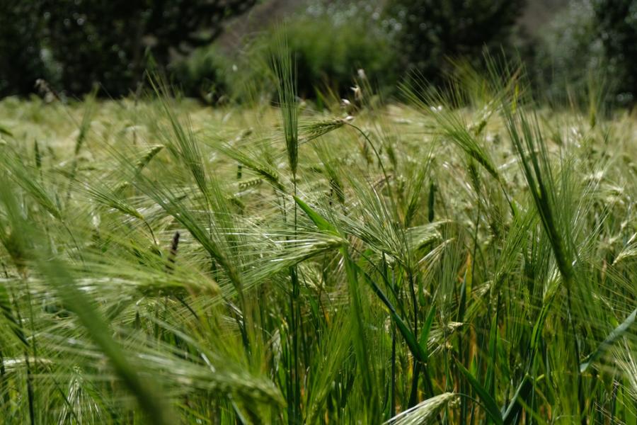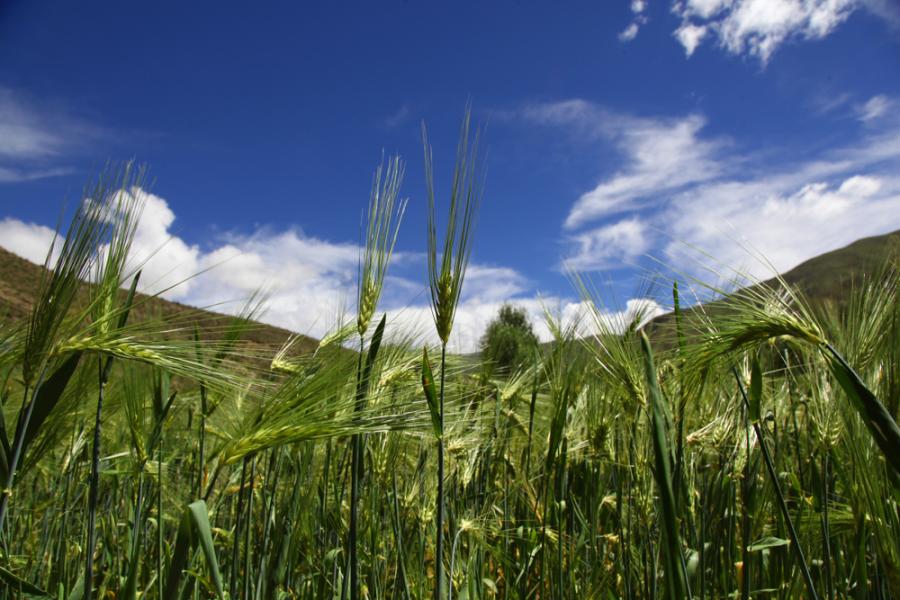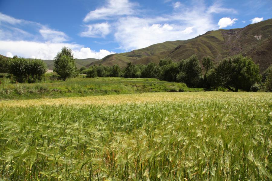 A valley is covered in lush highland barley in Lhoka, Tibet. Known as Tibetan barley or Himalayan barley, it is the principal cereal cultivated on the Qinghai-Tibet plateau, and is used to make milk tea, alcohol, flour and various kinds of food such as tsampa, bread, cakes and noodles. (Photo/China Plus)