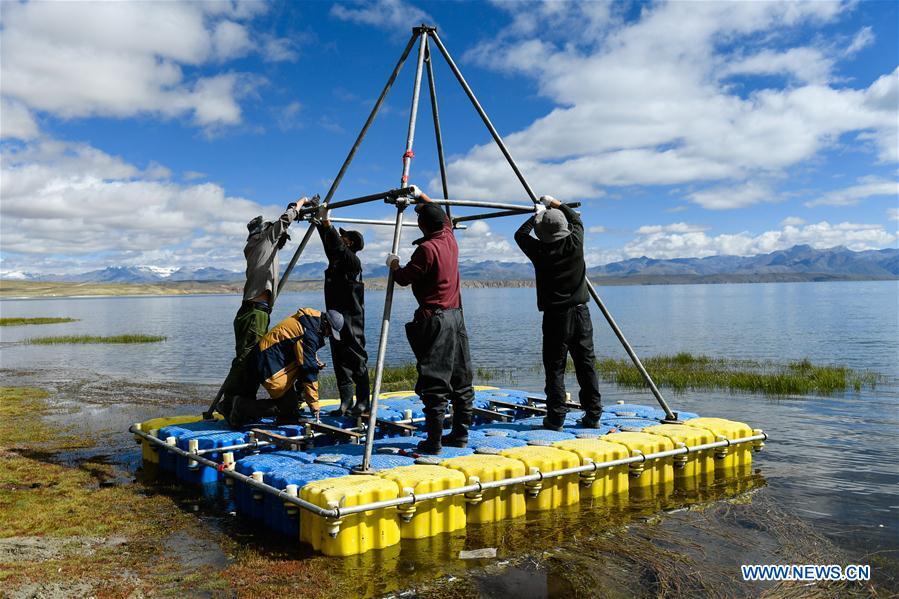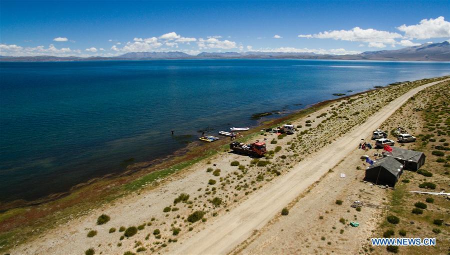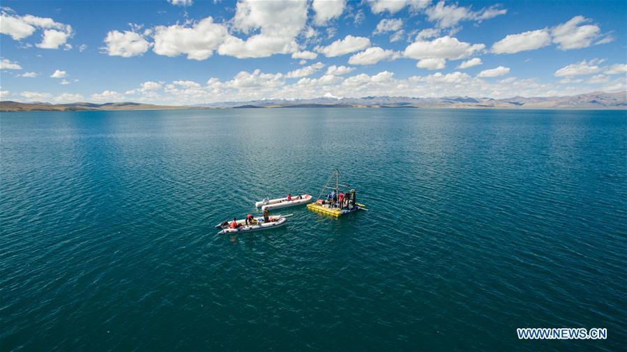 Scientific expedition team members conduct research on a lake in Ngari Prefecture, southwest China's Tibet Autonomous Region, Sept. 4, 2017. Scientists and researchers participating in China's second scientific expedition of the Qinghai-Tibet Plateau have entered Ngari Prefecture in Tibet Autonomous Region. The team will inspect more than ten major lakes and rivers in Ngari and Xigaze prefectures and study the local climate, lake sediment, lake floors and biodiversity of the region. (Xinhua/Liu Dongjun)