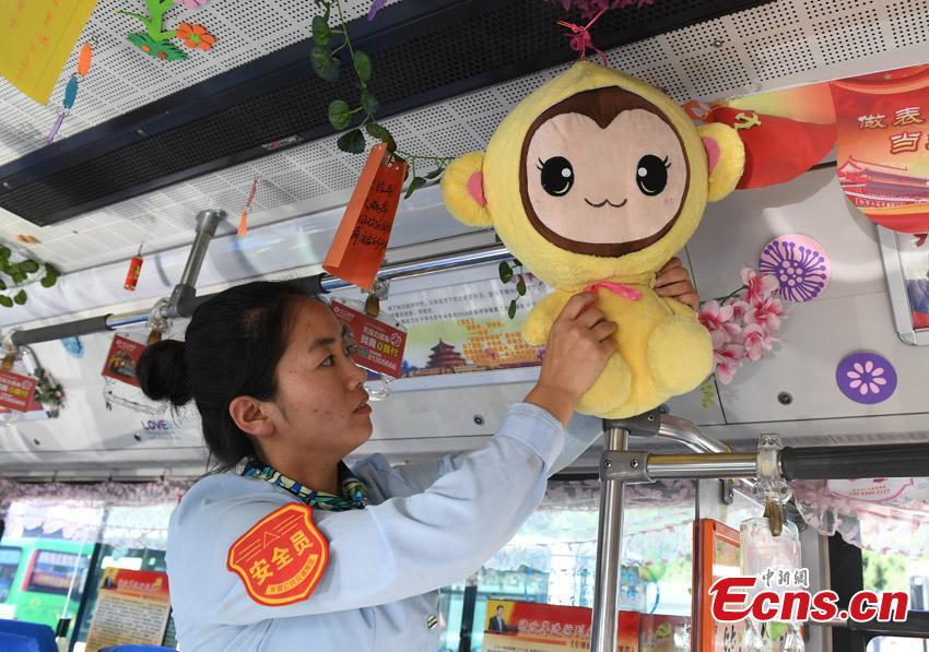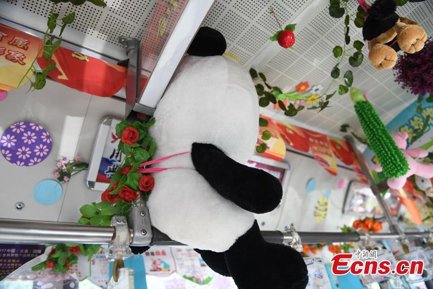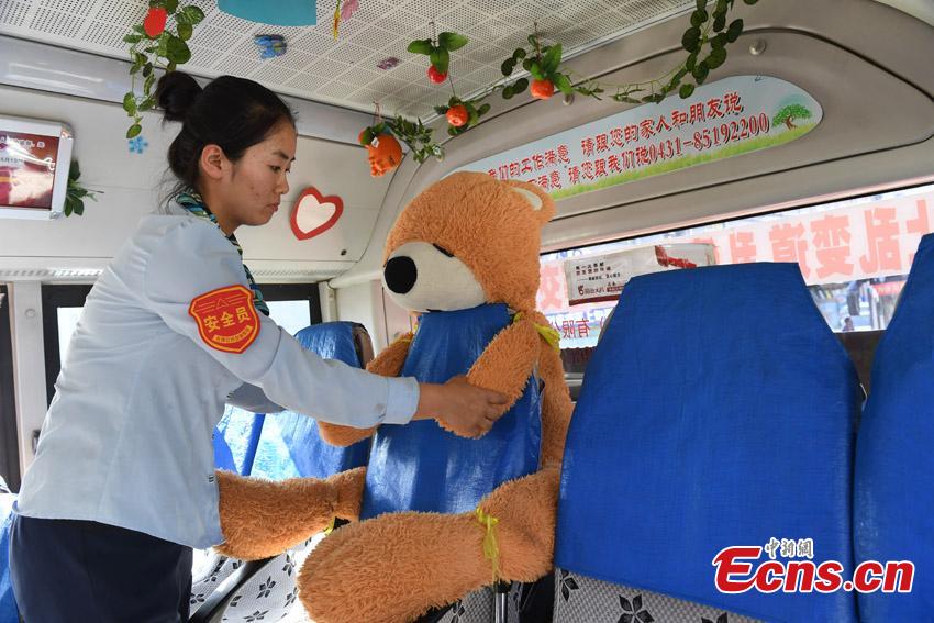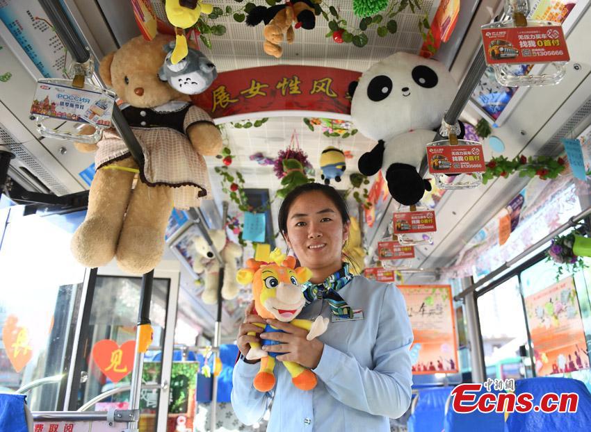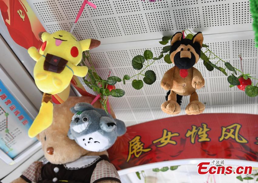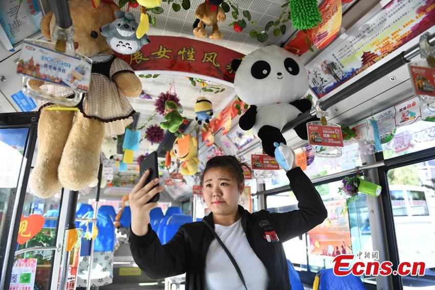 Bus driver Li Shuo decorates her bus with all kinds of soft toys in Changchun City, the capital of Northeast China’s Jilin Province, Sept. 7, 2017. Li Shuo, 26, says from a young age her father bought her more than 30 soft toys as reward for good deeds. Li now uses the toys to decorate her bus as well as giving some to those in need. (Photo: China News Service/Zhang Yao)