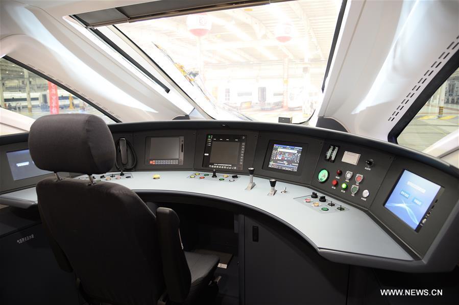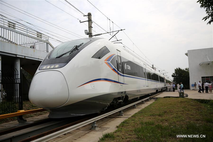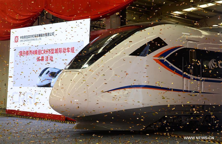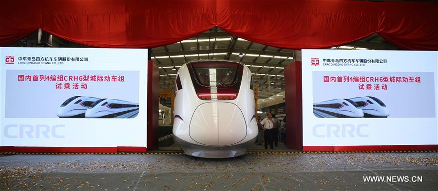 Photo taken on Sept. 9, 2017 shows a CRH6A-A intercity train in Qingdao, east China's Shandong Province. China's CRH6A-A and CRH6F-A intercity trains, with the four-car configuration, went off the production line in Qingdao on Saturday. (Xinhua/Zhang Xudong)