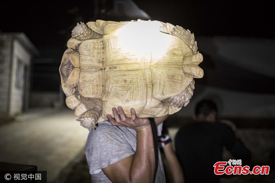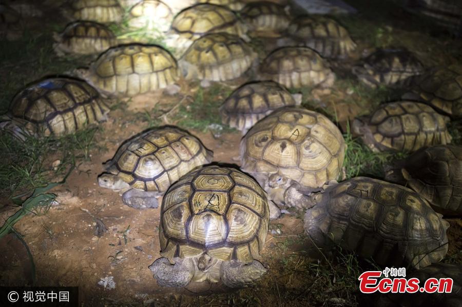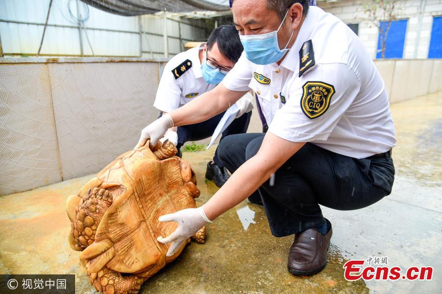 China’s inspection and quarantine officers examine some African spurred tortoises, imported from Sudan, at a customs port in Guangzhou City, the capital of South China’s Guangdong Province. The 200 tortoises, the third-largest species of tortoise in the world, will be used mainly for viewing and reproduction purposes. (Photo/VCG)