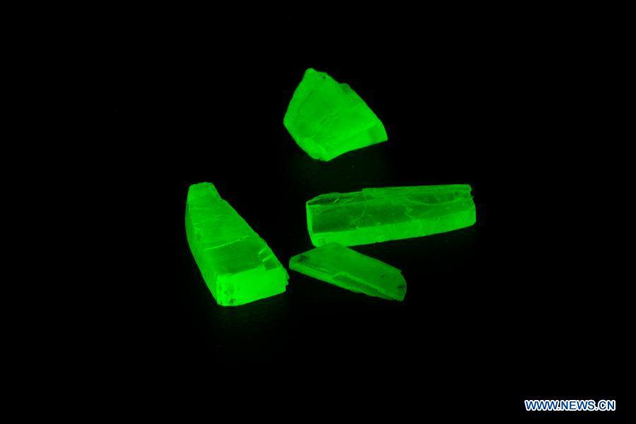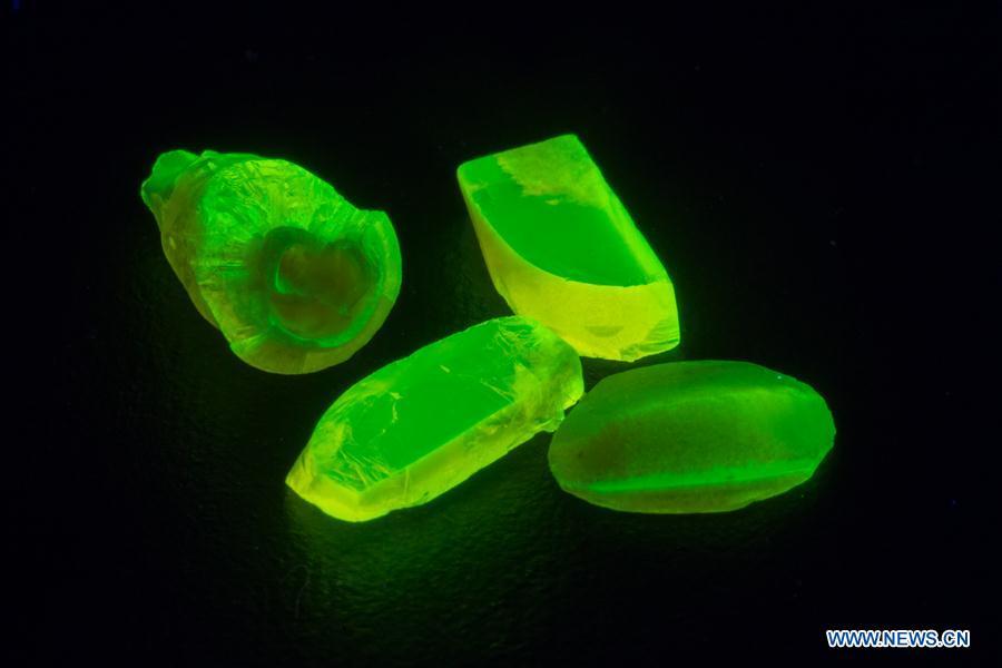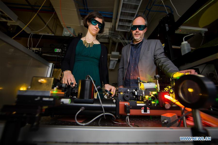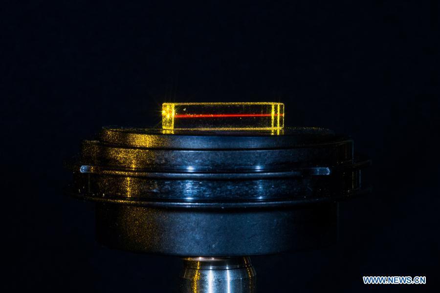 Photo taken on Sept. 6, 2017 shows red fluorescence from the rare earth ions in an yttrium orthosilicate crystal interacting with a (yellow) laser beam in the Australian National University (ANU), Canberra. Australian scientists have made a significant breakthrough in developing an "unhackable" quantum internet, it was announced on Sept. 12. (Xinhua/ANU/Stuart Hay)
