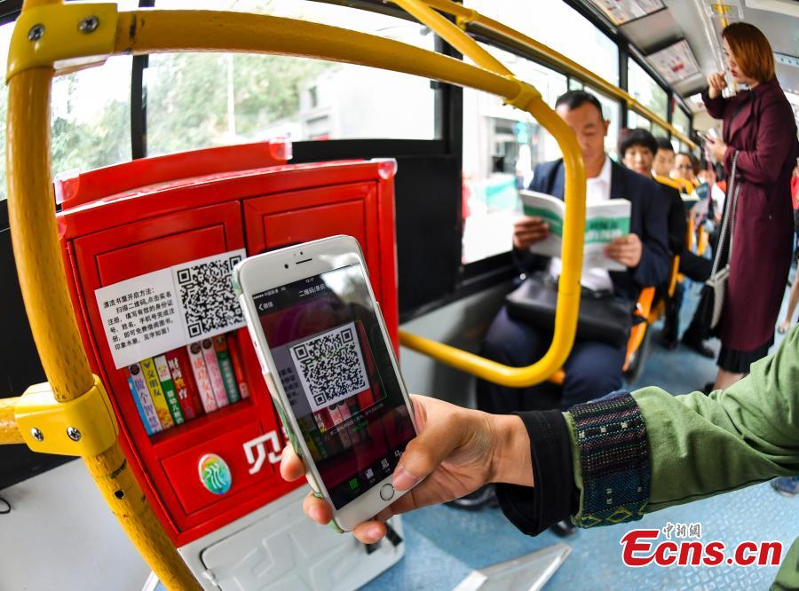 A book-lending machine installed on a bus in Urumqi City, the capital of Northwest China’s Xinjiang Uygur Autonomous Region, Sept. 13, 2017. After registration, passengers can scan the QR code with their mobile phone to unlock the machine and borrow a book for free. Ten book-lending machines, which hold 30 books each, will be installed on more buses. (Photo: China News Service/Liu Xin)