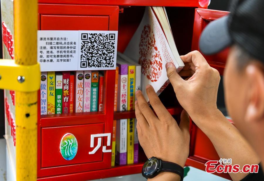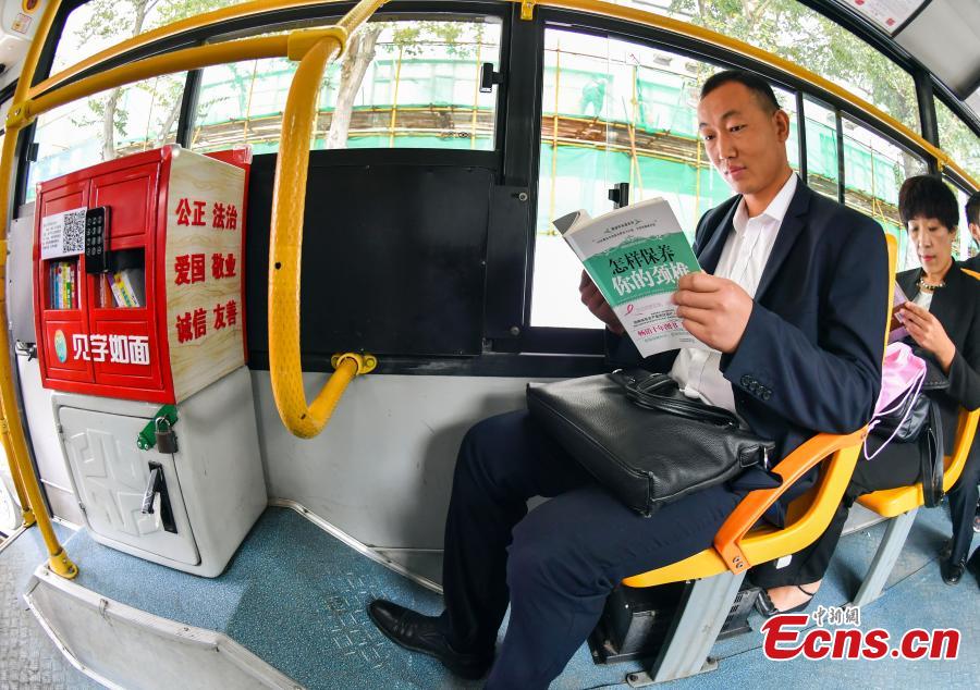 A book-lending machine installed on a bus in Urumqi City, the capital of Northwest China’s Xinjiang Uygur Autonomous Region, Sept. 13, 2017. After registration, passengers can scan the QR code with their mobile phone to unlock the machine and borrow a book for free. Ten book-lending machines, which hold 30 books each, will be installed on more buses. (Photo: China News Service/Liu Xin)