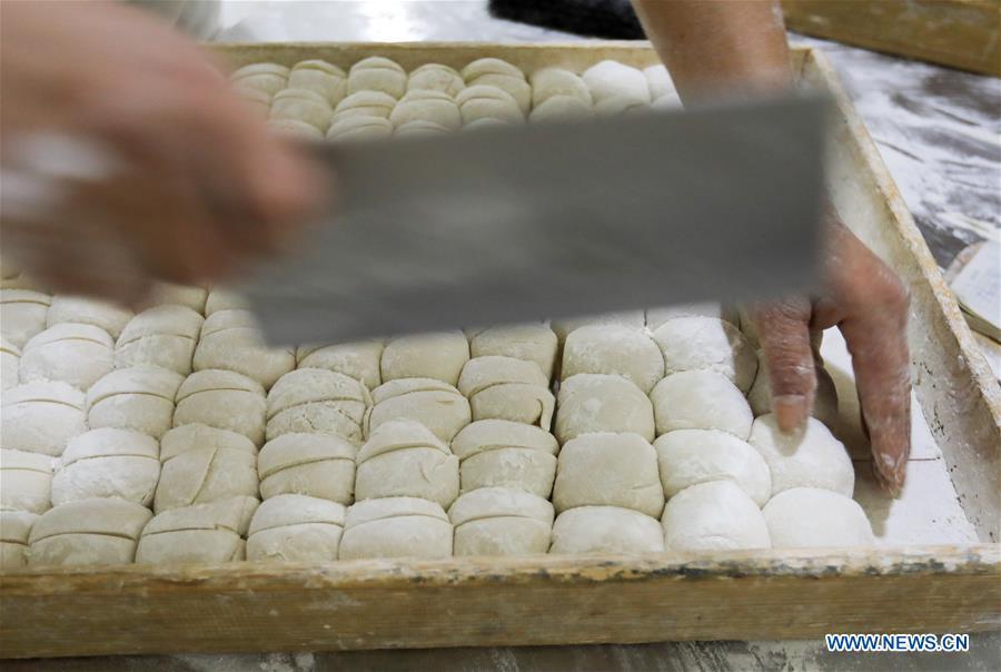 A worker taps a red stamp onto finished Baoning sweet steamed buns at a bakery in Langzhong, southwest China's Sichuan Province, Sept. 13, 2017. As a local intangible cultural heritage, the special steamed bun here gained great reputation in the area. For hundreds of years, the bun has been produced under 21 complete procedures, and finished with a red stamp proving the authenticity. (Xinhua/Liu Chan)