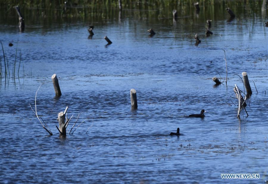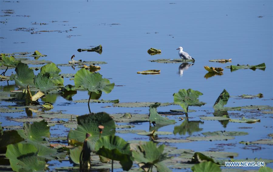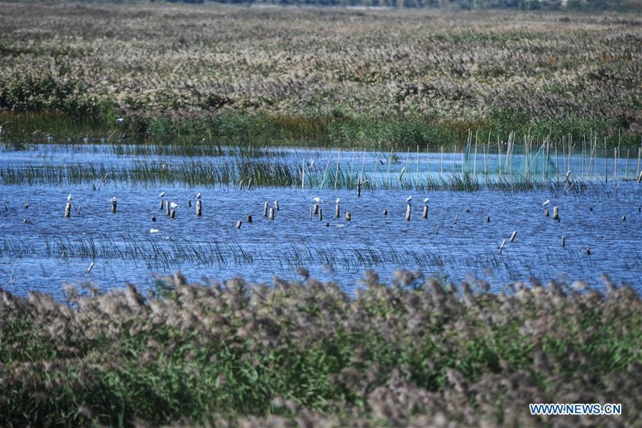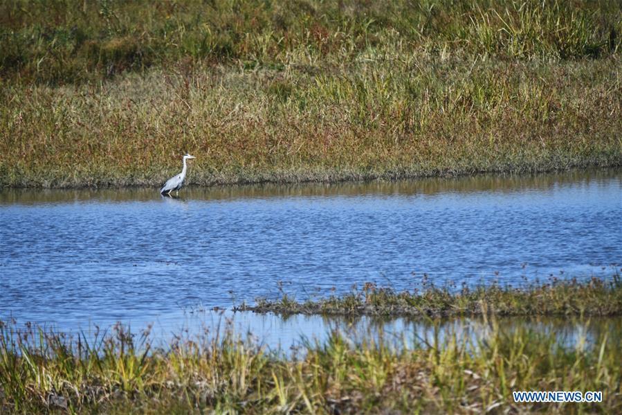 A gray heron flies over the Momoge state-level nature reserve, a wetland in Zhenlai County of Baicheng City, northeast China's Jilin Province, Sept. 13, 2017. The Momoge nature reserve is a stopover site and breeding place for migratory birds flying south to winter. It attracts hundreds of thousands of migratory birds every year. (Xinhua/Zhang Nan)