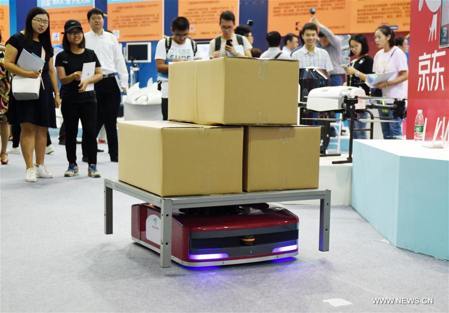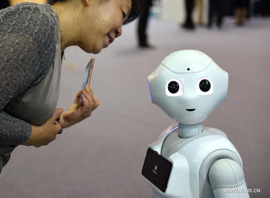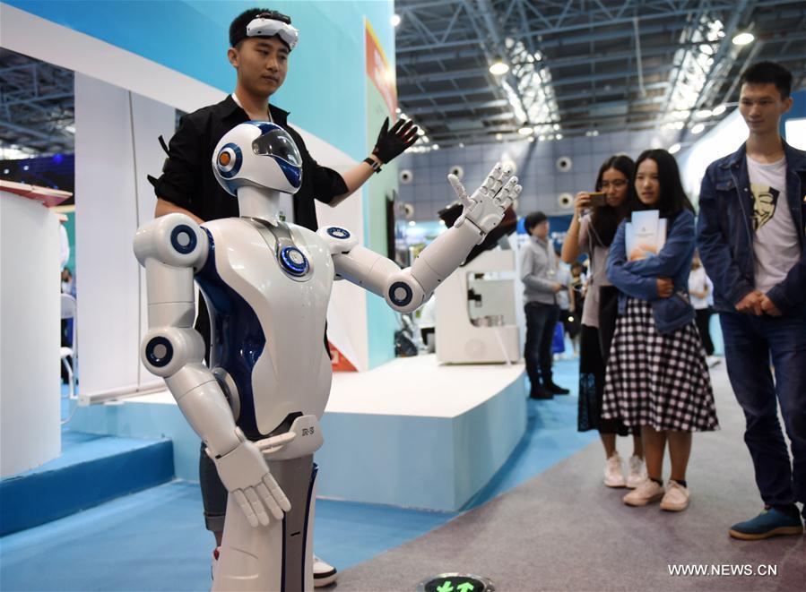 People look at a bionic robot at an exhibition during the 2017 national mass innovation and entrepreneurship week in Beijing, capital of China, Sept. 15, 2017. More than 300 items and projects on artificial intelligence, biotechnology, new material, energy conservation, environmental protection, intelligent robot and Internet plus were displayed at the exhibition. (Xinhua/Zhang Chenlin)
