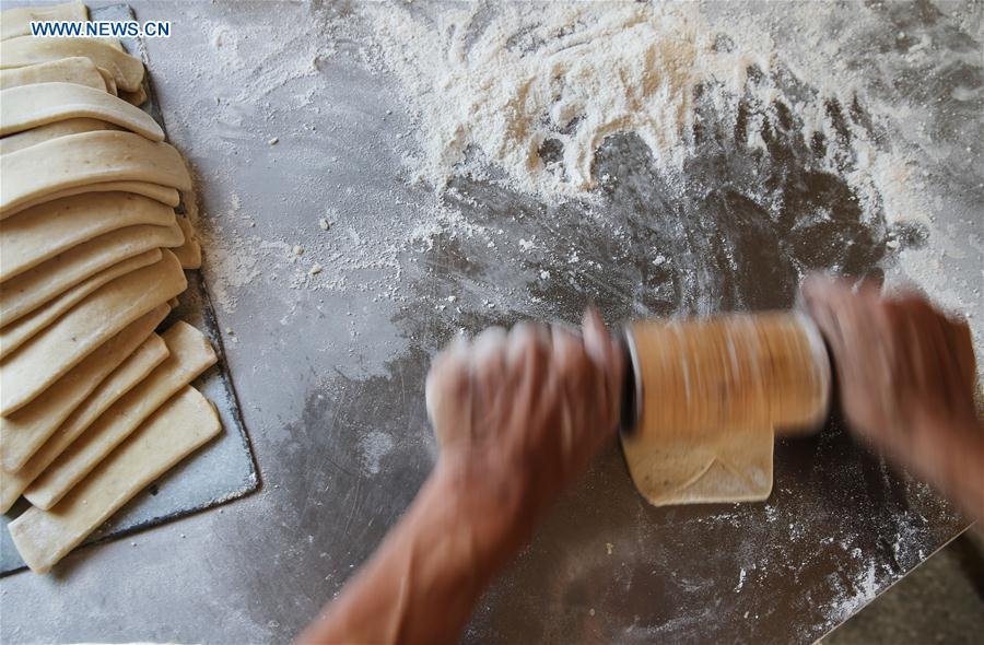 Sesame seed cakes are baked in an oven at a workshop in Xiting Township of Nantong City, east China's Jiangsu Province, Sept. 18, 2017. The traditional food of Xiting sesame seed cake has a long history dating back to over a hundred years ago. (Xinhua/Xu Congjun)