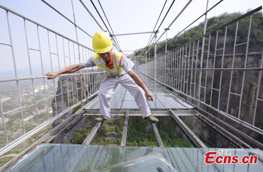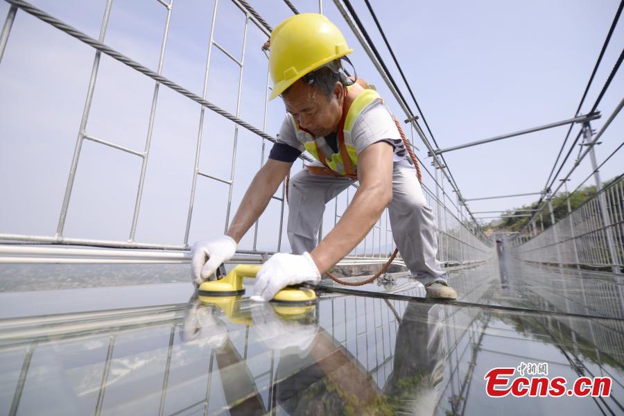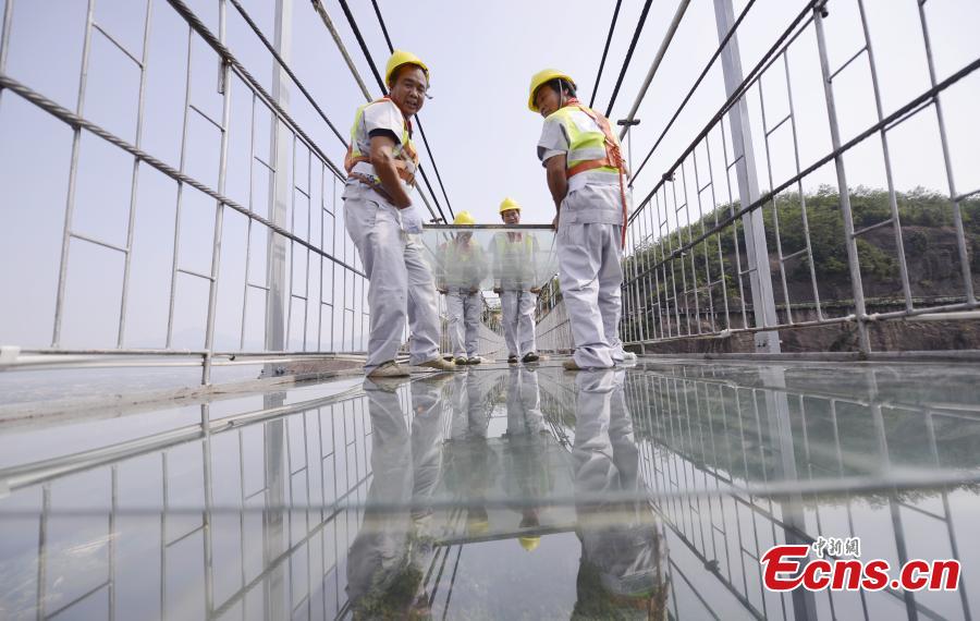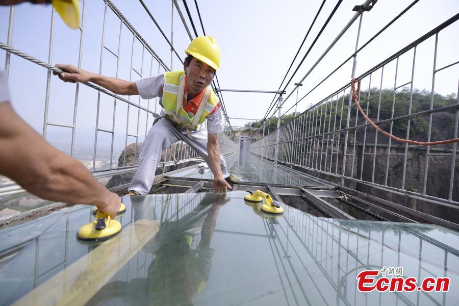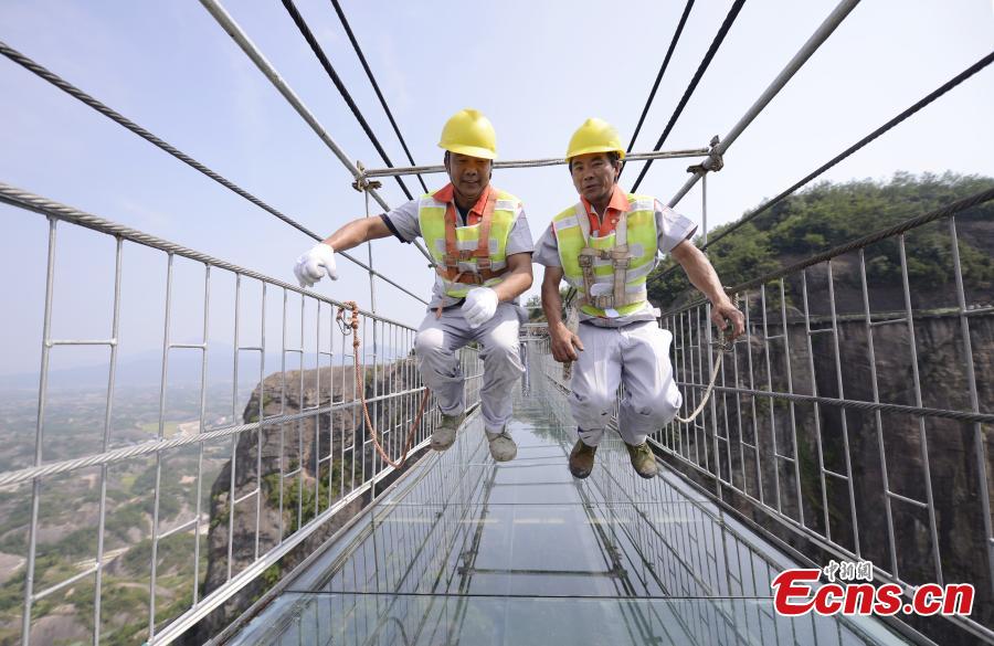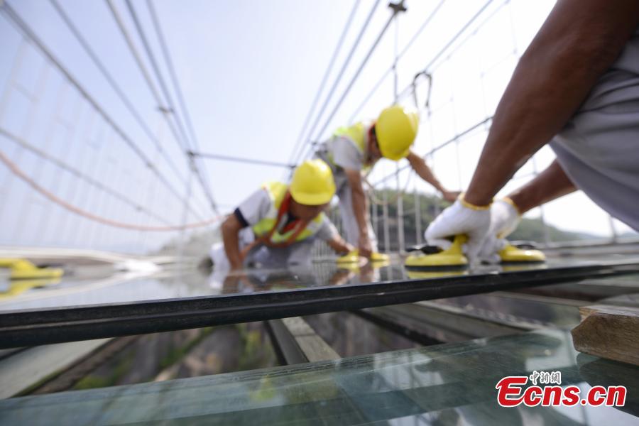 Workers check and replace glass on a glass walkway, suspended 180 meters in the air, in the Shiniuzhai National Geological Park in Pingjiang County, Central China’s Hunan Province, Sept. 18, 2017. Authorities at the park ensure a comprehensive check of the glass-bottomed bridge is conducted to prepare for peak tourist numbers during the National Day holiday from Oct. 1 to 8. (Photo: China News Service/Yang Huafeng)