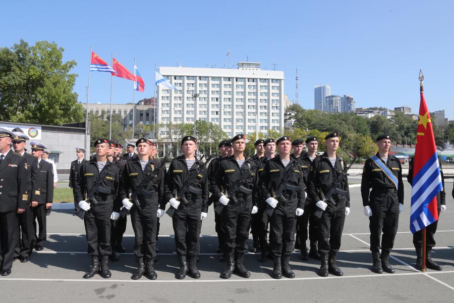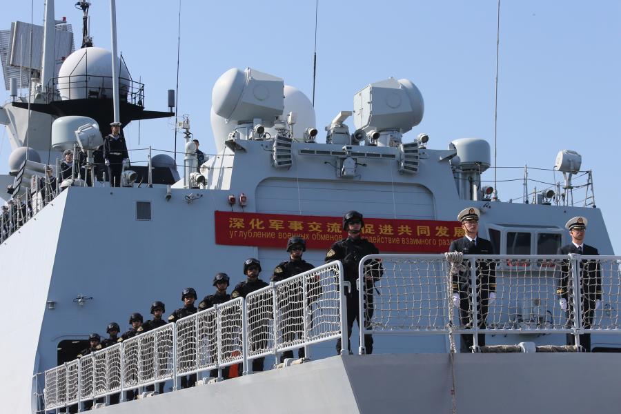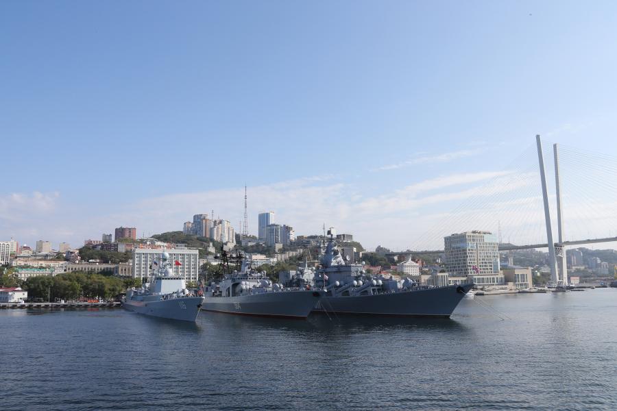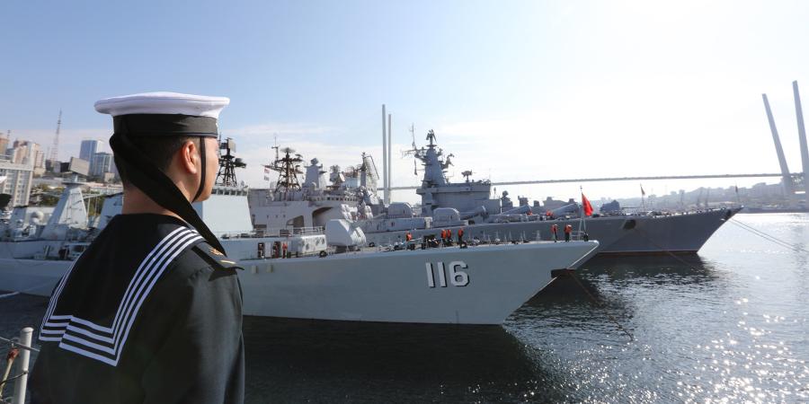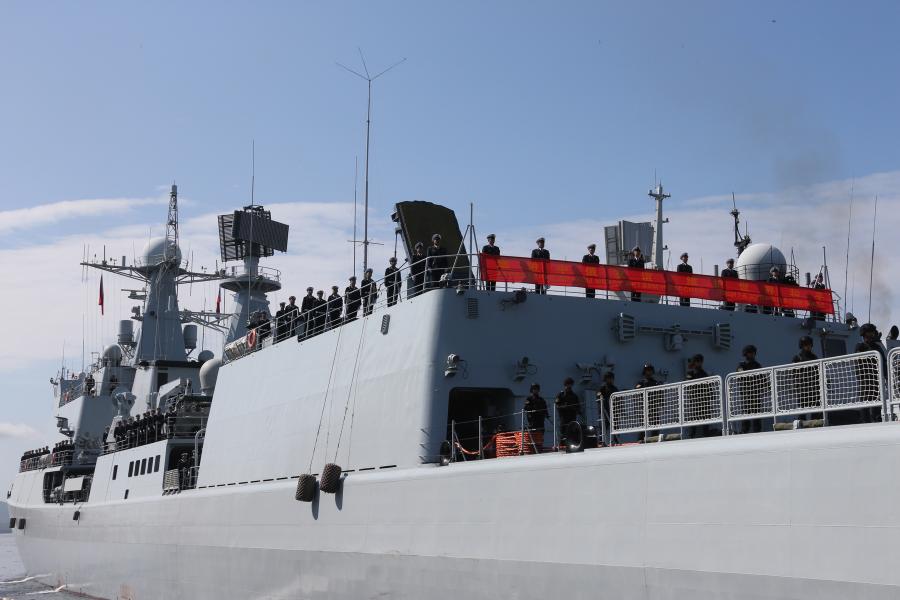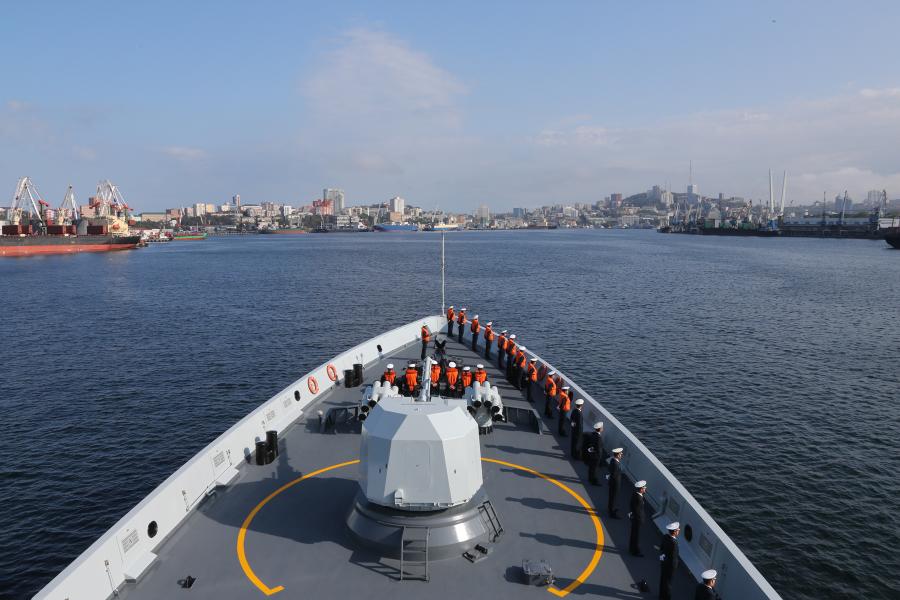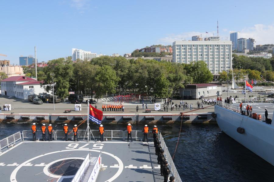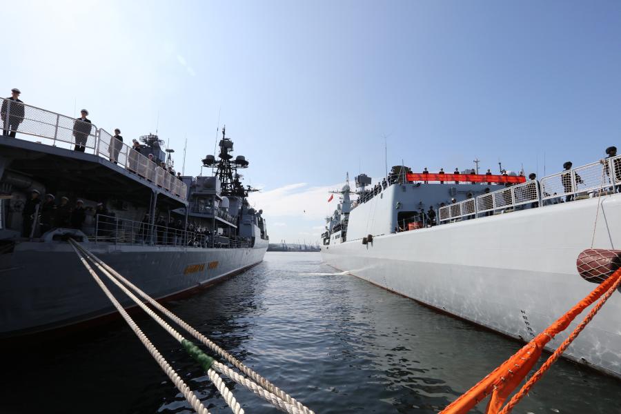 A four-vessel Chinese naval fleet comprised of the guided-missile destroyer Shijiazhuang (Hull 116), the guided-missile frigate Daqing (Hull 576), the comprehensive supply ship Dongpinghu (Hull 960) and the submarine rescue ship Changdao (Hull 867), arrives at a naval port in Russia's Vladivostok on Sept. 18, 2017. The second stage of the China-Russia Joint Sea - 2017 military exercise is scheduled to be held in Vladivostok from September 18 to 26, 2017. (Photo/eng.chinamil.com.cn)