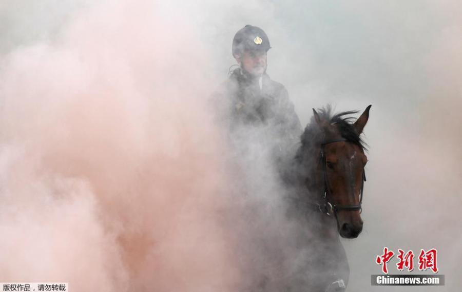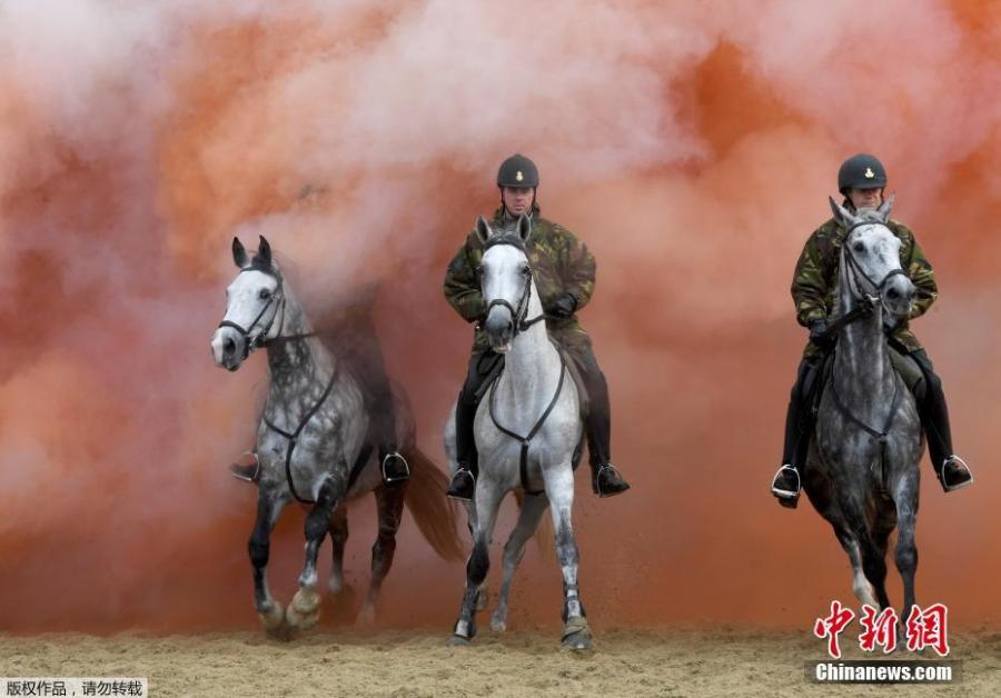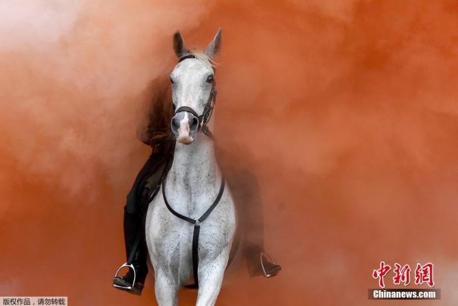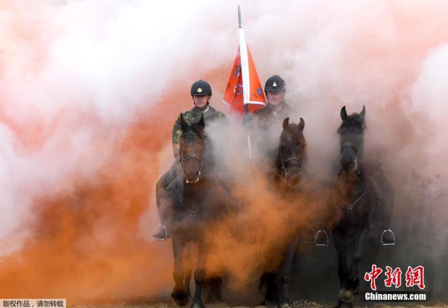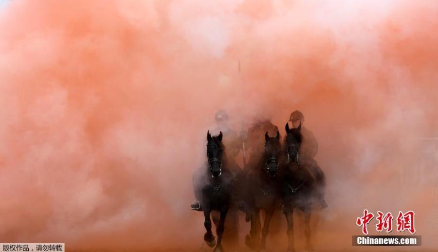 Cavalry horses and their riders are exposed to smoke as members of the Dutch cavalry undergo a stress test at the beach in Scheveningen, Sept. 18, 2017. The horses and riders are tested with gunfire, music and smoke for the next day's parade in The Hague, including the King and Queen in the Glass Carriage who will pronounce the Speech from the Throne, one of the main features of government policy for the coming parliamentary session at Prinsjesdag' (Prince's Day). (Photo/VCG)