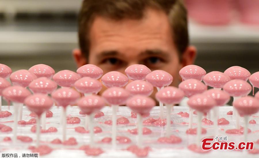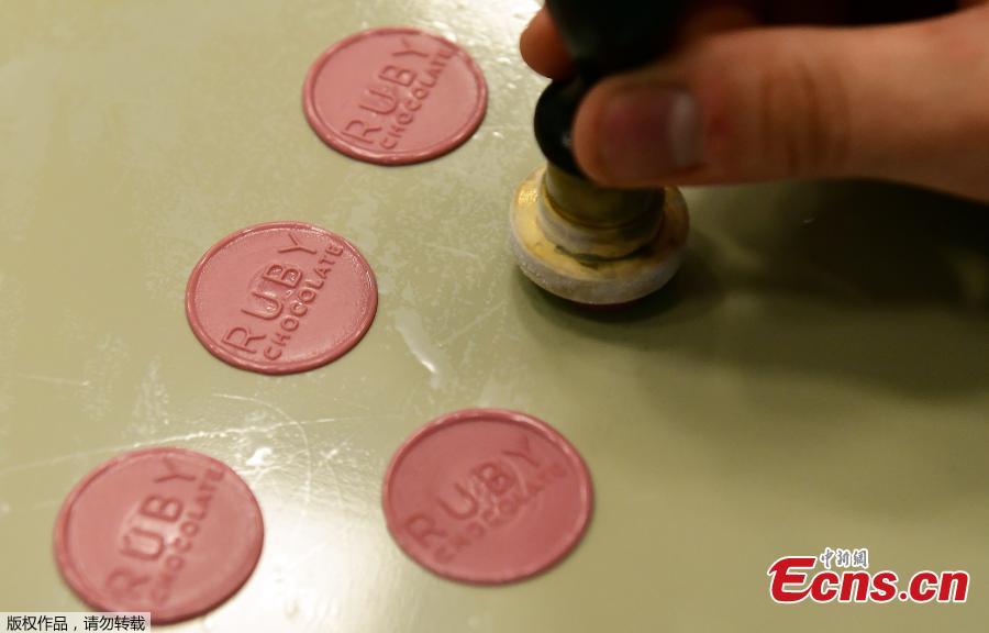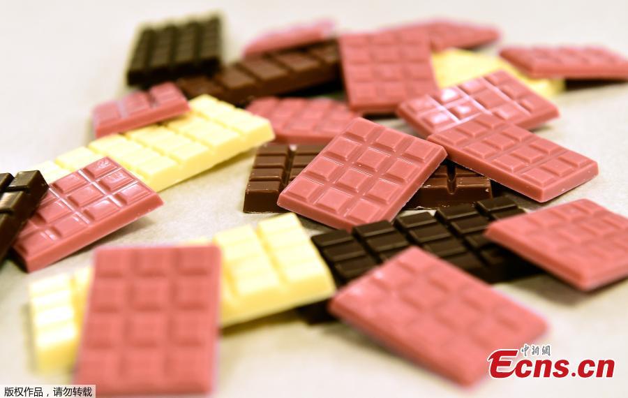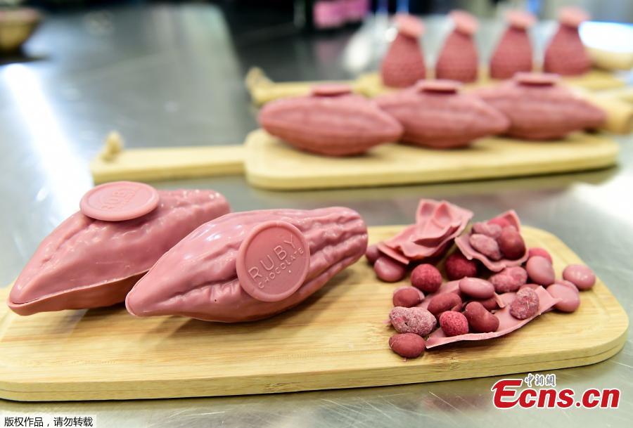Ruby chocolate, a new pink chocolate obtained without adding berries, flavors or colorants, is presented to the media at the Barry Callebaut Belgium factory in Lebbeke-Wieze, Sept. 18, 2017. Barry Callebaut, the world leader in cocoa, presented Ruby (pink) chocolate as the fourth category, along with dark chocolate, milk and white, in the name of a cocoa bean of the same name. This discovery kicked off the search for years of experience in the group's workshops in France and Belgium, to understand how to exploit the properties of the ruby bean and then set up a manufacturing process. (Photo/Agencies)