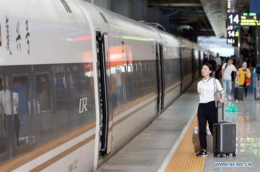 The G10 Fuxing bullet train running on the Beijing-Shanghai high-speed railway leaves Shanghai Hongqiao Railway Station in Shanghai, east China, Sept. 21, 2017. China began Thursday to restore the maximum speed of bullet train on the Beijing-Shanghai high-speed railway to 350 kilometers per hour, six years after it was reduced to 300 kmh. (Xinhua/Fan Jun)