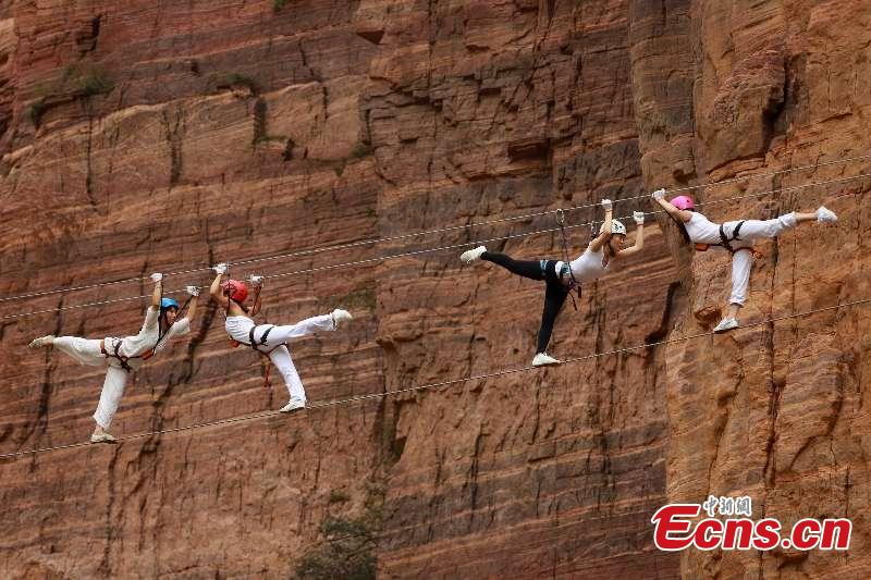 Yoga enthusiasts perform yoga on a 200-meter-high cliff at a scenic spot in Luoyang, Henan province, Sept 23, 2017. (Photo: China News Service/Xu Zhiqing)
