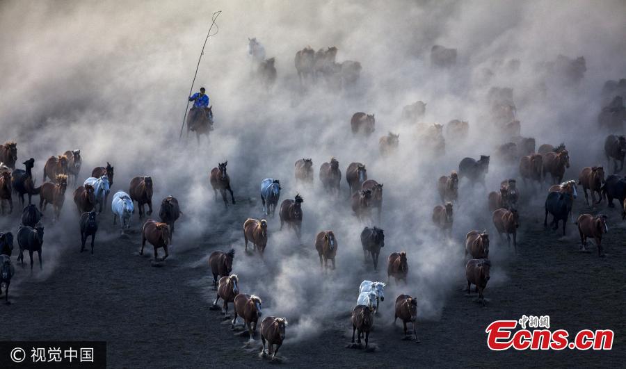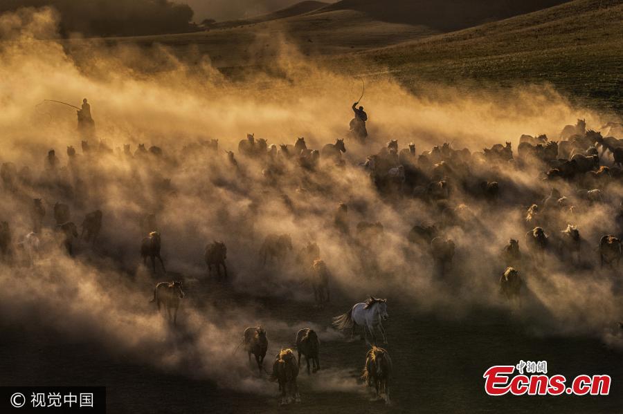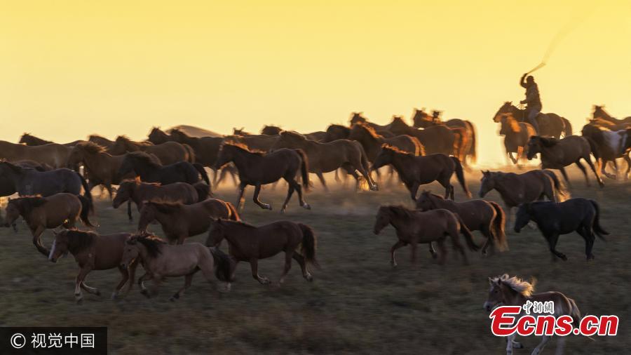 Horses gallop on grasslands in Ulan Buh, Hexigten Banner, Northwest China’s Inner Mongolia Autonomous Region, Sept. 24, 2017. It’s a spectacular scene watching horses race across the grasslands in the morning glow, a huge appeal for tourists and photographers. (Photo/VCG)