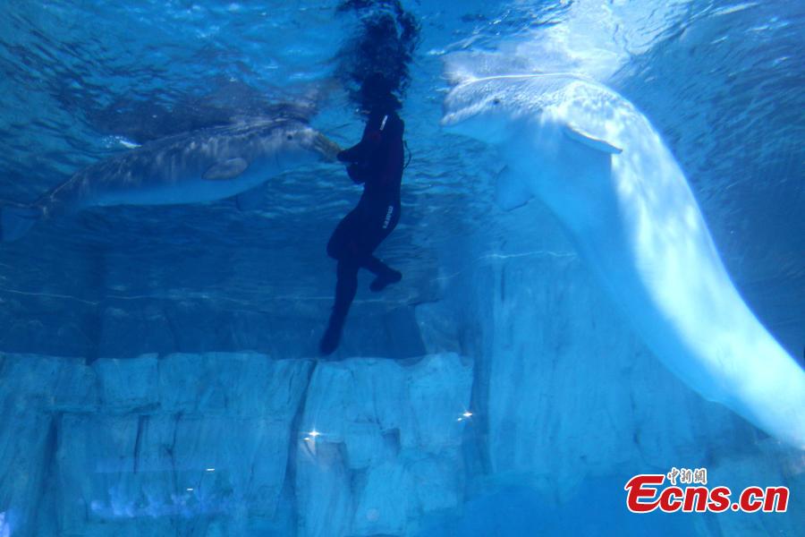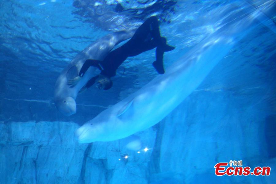 A one-year-old female beluga whale and its mother swim in a sea world park in Changsha City, the capital of Central China’s Hunan Province, Sept. 22, 2017. The female beluga whale is the first to be born as well as survive in an artificial feeding environment in China. The whale was born Sept 22 last year and weighed about 100 kilograms at birth. It’s now about three meters long. (Photo: China News Service/Li Fangsen)