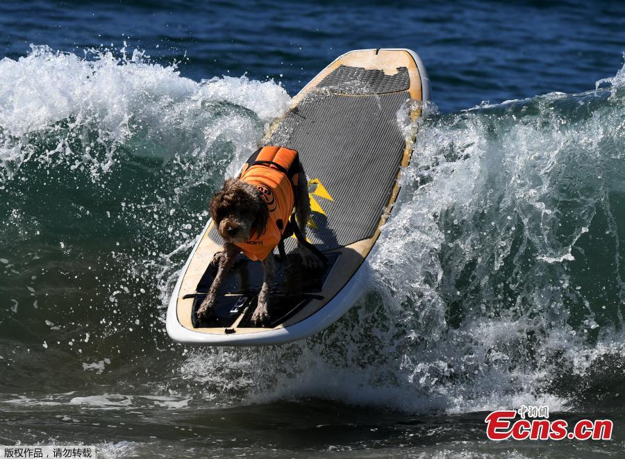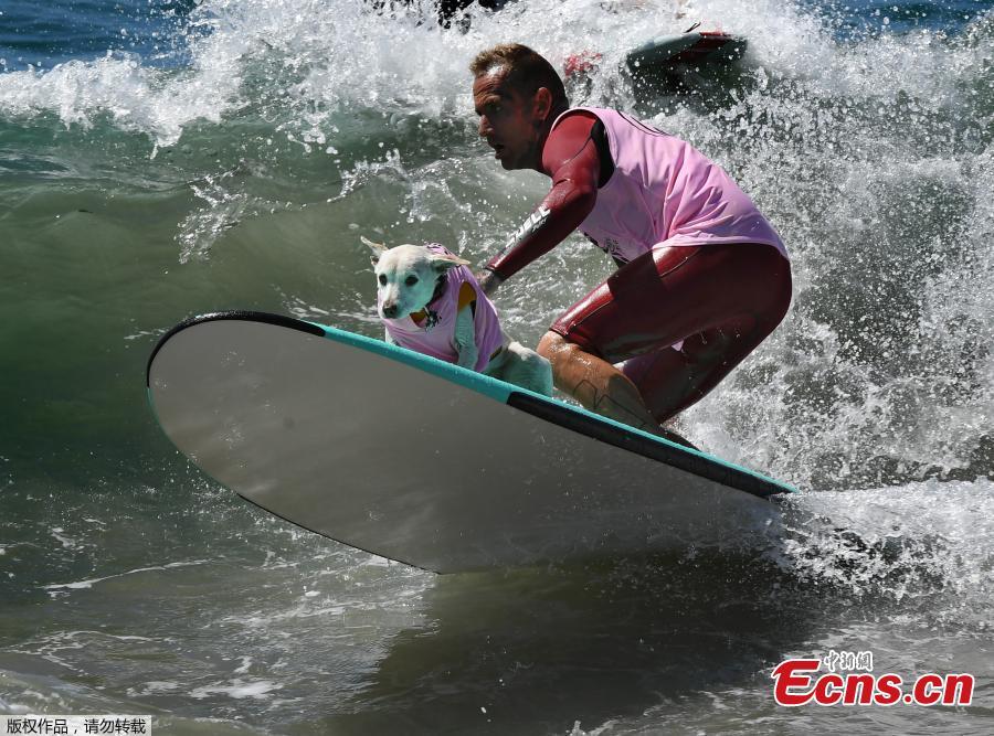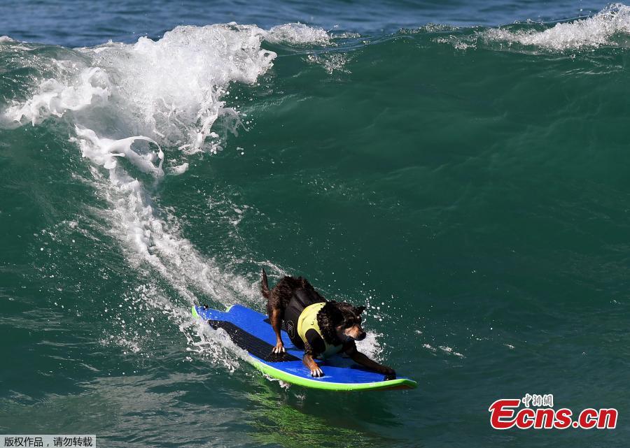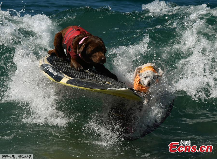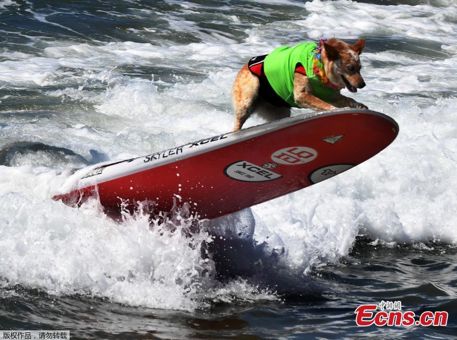 Surf dog Skyler rids the nose as she competes in the Tandem event during the 9th annual Surf City Surf Dog event at Huntington Beach, California, Sept. 23, 2017. Dogs, big and small, and some in tandem braved the large swell that greeted them during the iconic event. (Photo/Agencies)
