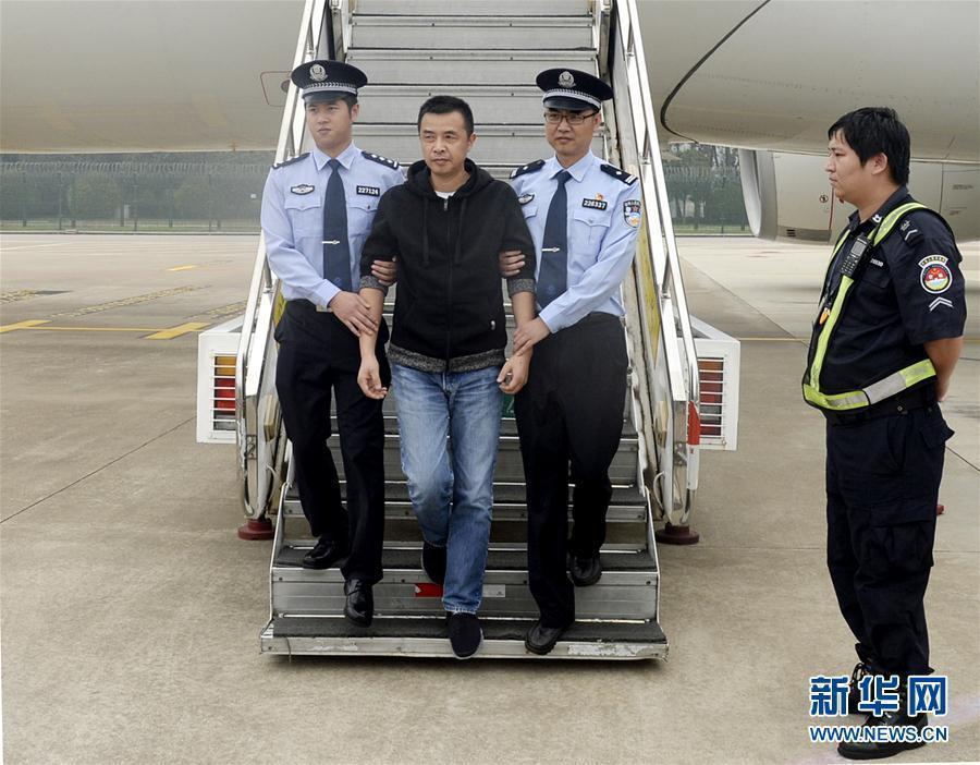 A fugitive suspected of contract fraud returned to China Monday to turn himself in, according to the Communist Party of China's disciplinary authority. Xu Xuewei, who was the actual controller of a science and technology company and a chemical fiber company based in Jiangyin City in east China's Jiangsu Province, fled to the United States in November 2012, the Central Commission for Discipline Inspection (CCDI) said. He was number 91 on China's top 100 fugitives listed in an Interpol "red notice," and the 46th to return so far. (Photo/Xinhua)