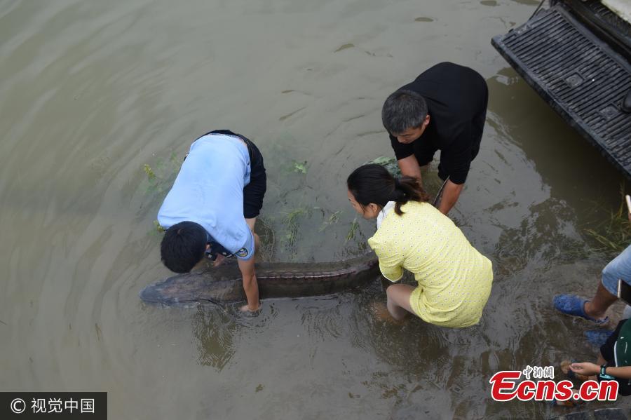 Police and fishery officers release a Chinese sturgeon into the Yangtze River in Zhongxian County, Southwest China’s Sichuan Province, Sept. 24, 2017. A fisherman caught the adult fish, which is threatened with extinction in the Yangtze River and under first-class animal protection in China, and then handed it to local authorities. It measures 1.8 meters in length and weighs 50 kilograms. This is the first time in 30 years a wild Chinese sturgeon has been found in the upper reaches of the Yangtze River. (Photo/VCG)