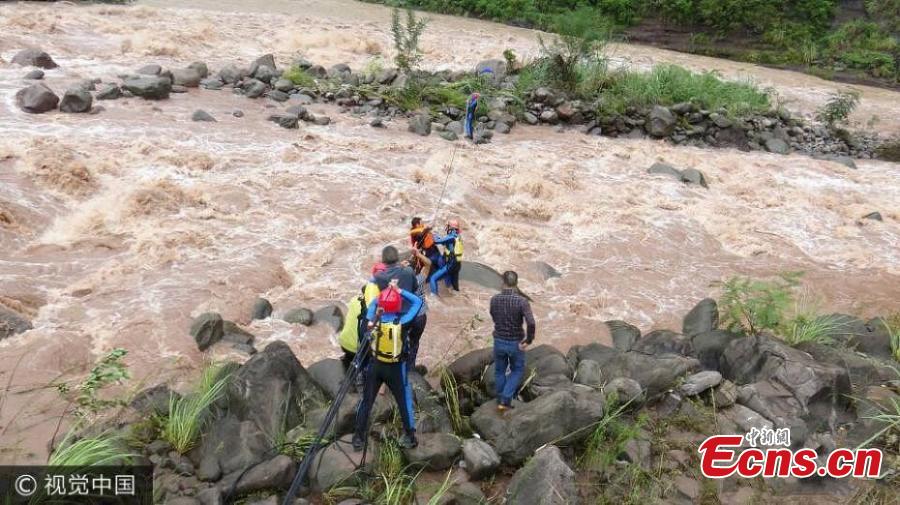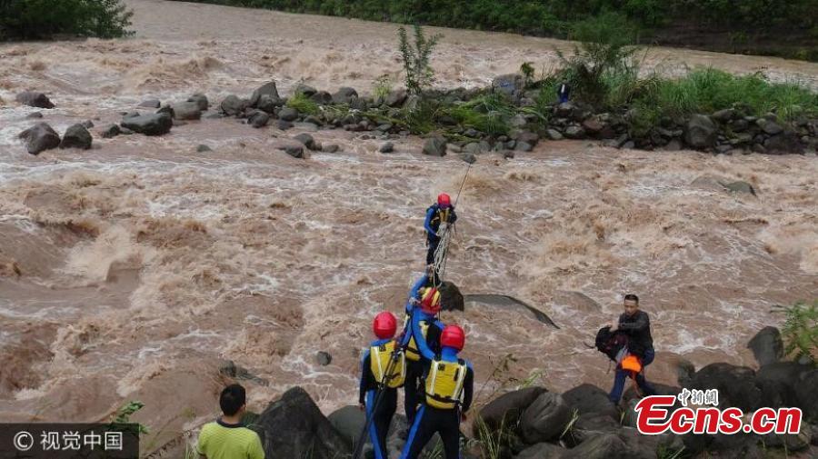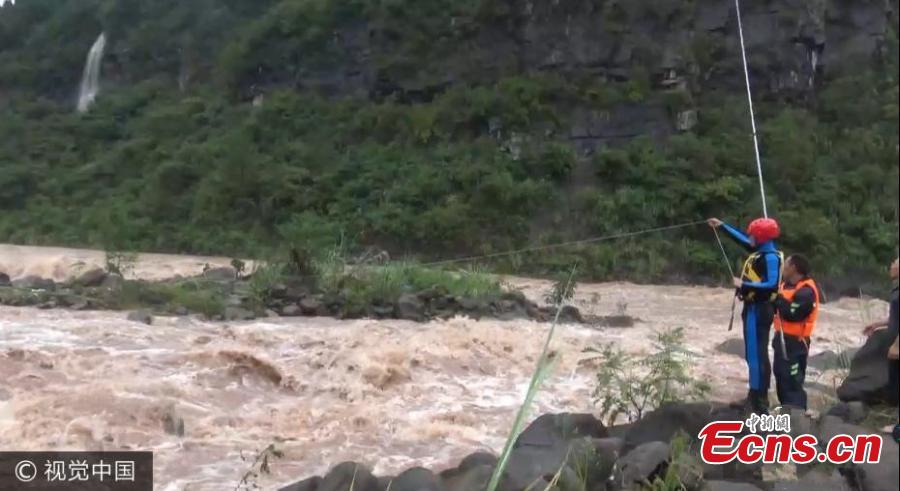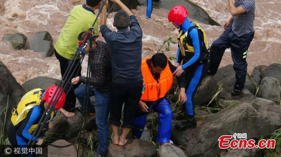 Rescuers help a fishing enthusiast stranded on an island in the middle of a river in Fengjie County, Southwest China’s Chongqing Municipality, Sept. 24, 2017. The man focused too much on fishing and didn’t realize his way back to land was cut off by rising torrents. Soon after his evacuation, luckily with the help of a fishhook, the island was submerged as a dam on the upper river released water. (Photo/VCG)