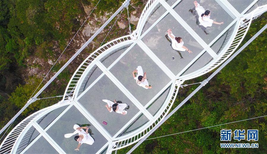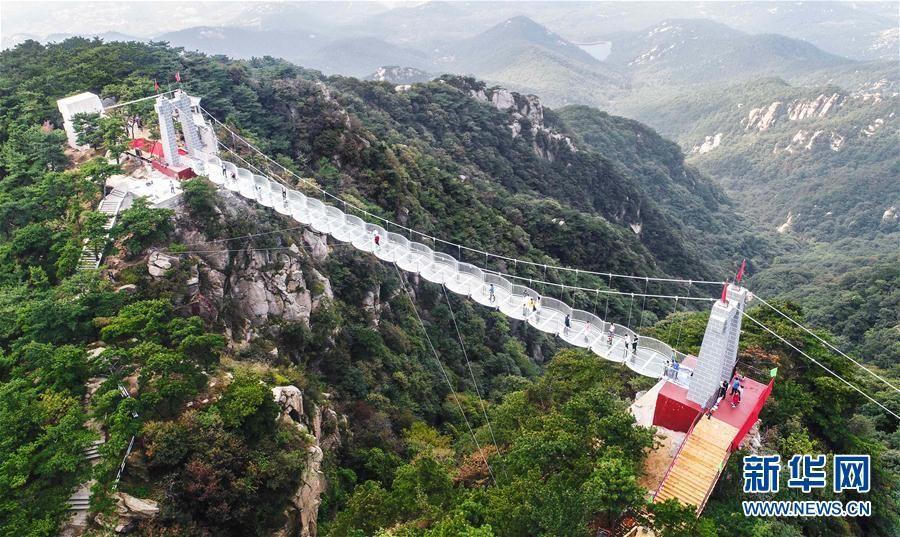 Not for the faint-hearted! A glass bridge has opened to the public in Guimeng Scenic Area in Linyi's Yimeng Mountain,east China's Shandong province before the upcoming National Holiday. The skywalk, situated over 1,000 meters above sea level on the Meng Mountain, is made of wire cable and hundreds of all-transparent toughened glasses. Visitors feel like walking in air while strolling on the high-altitude glass bridge, which is both thriling and stimulating! (Photo/Xinhua)