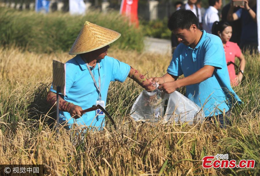 Researchers harvest seawater rice in Qingdao, Shandong province.A field test on Thursday of yields from an alkali-resisting "sea rice," developed by Yuan Longping, China's "father of hybrid rice," has exceeded expectations, according to scientists involved in the study. The Chinese scientists carried out the test on a field at a research center in Qingdao, East China's Shandong Province, and said that it paved the way for greater use of similar rice in China's 100 million hectares of saline-alkaline soil. The test center, for which Yuan is the chief scientist, was established in October 2016. In this test, the sea rice yield from saline-alkaline soil with a salinity of 3 per millage, was about 390 kilograms per 0.07 hectare, after using soil conditioner. This increased the yield by 20 percent, compared with rice yields without soil conditioner, said Wu Zhaohui, a fellow of the China National Hybrid Rice R&D Center, who joined the yield test in Qingdao. (Photo/VCG)