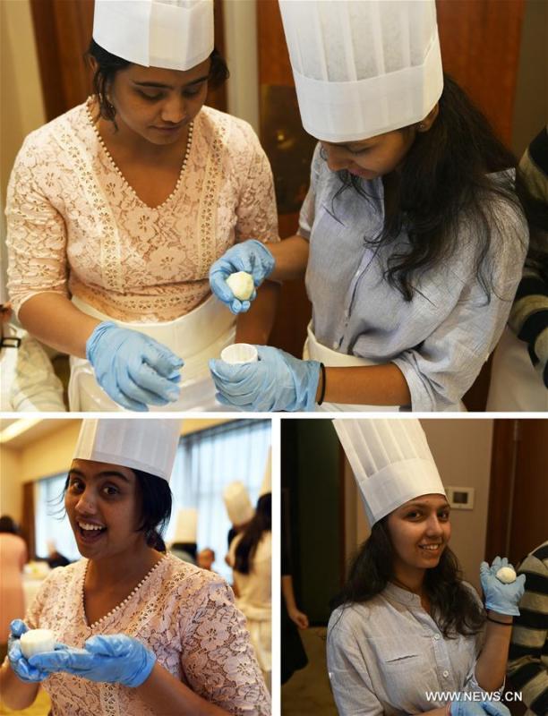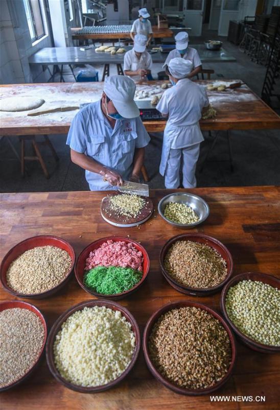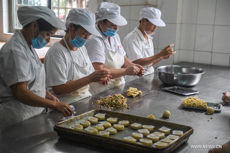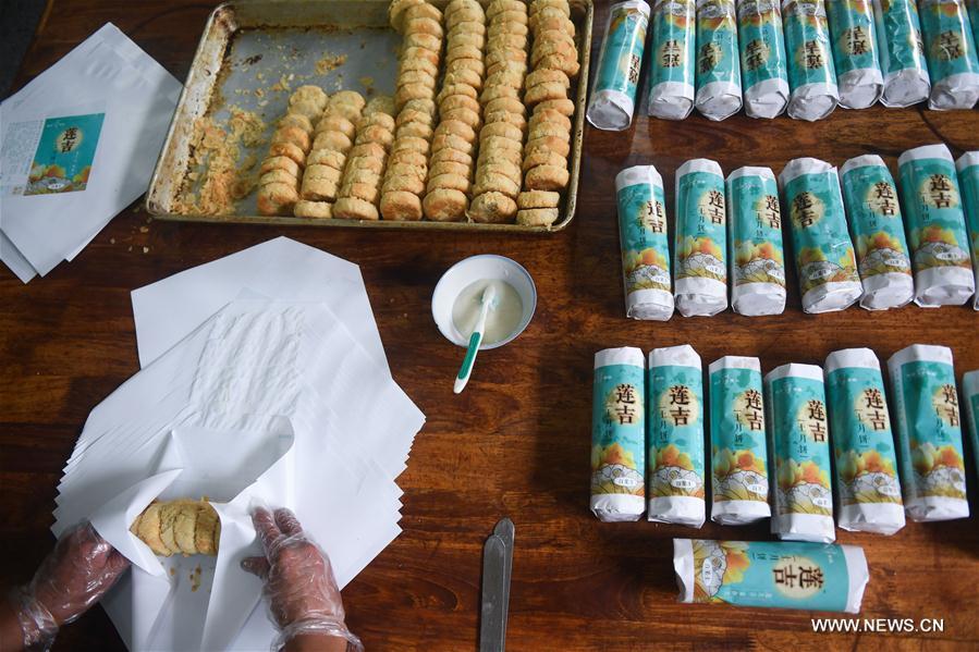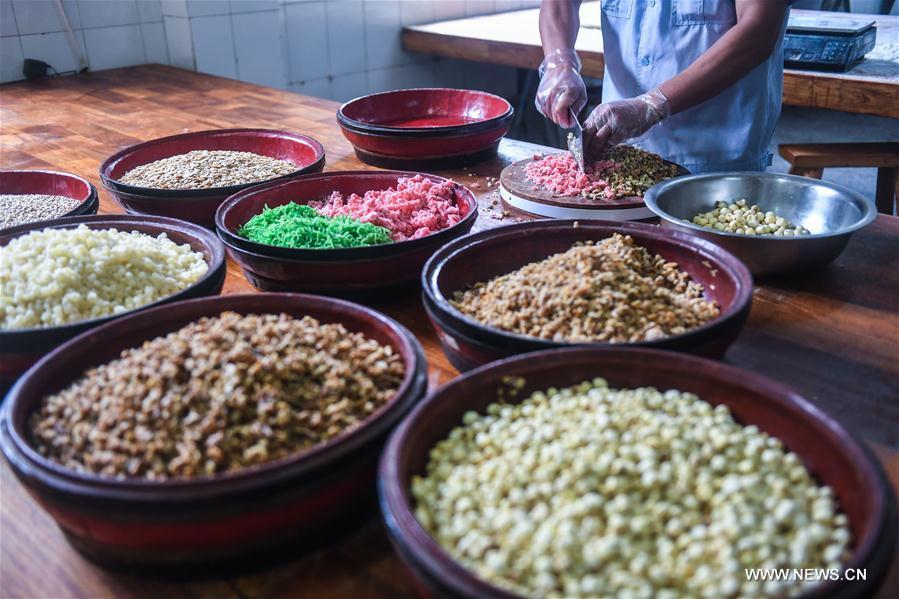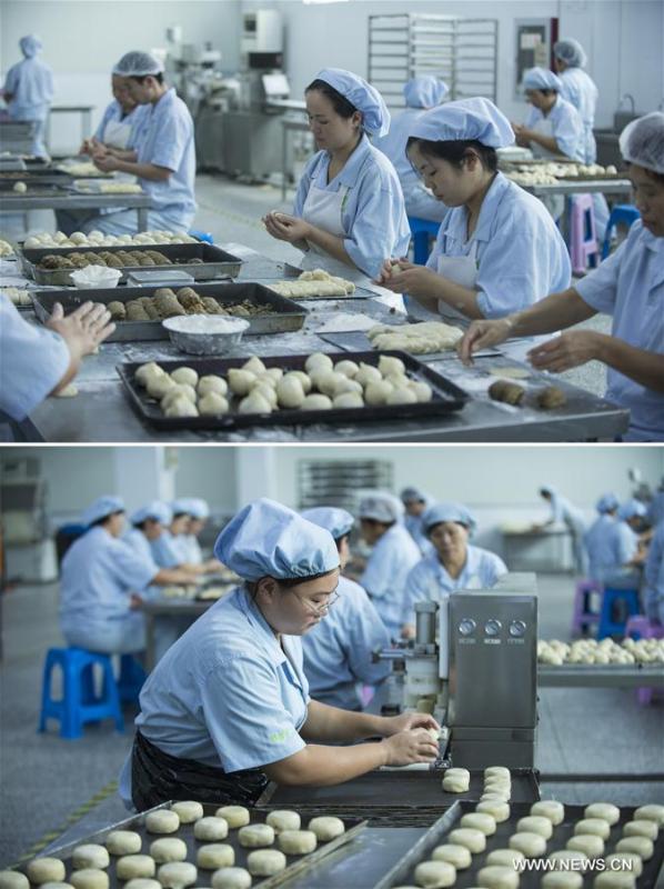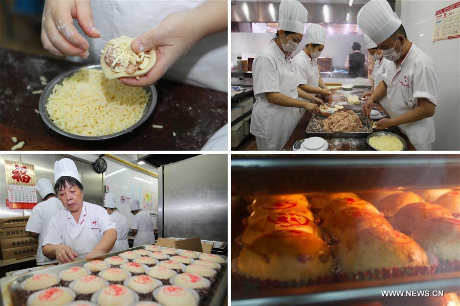 A baker makes mooncakes at a bakery in the Tangqi ancient town in Hangzhou, capital of east China's Zhejiang Province, Sept. 29, 2017. Mooncake is Chinese people's traditional dessert during the Mid-Autumn Festival, which falls on the 15th day of the 8th month of the Chinese lunar calendar, or Oct. 4 this year. (Xinhua/Xu Yu)