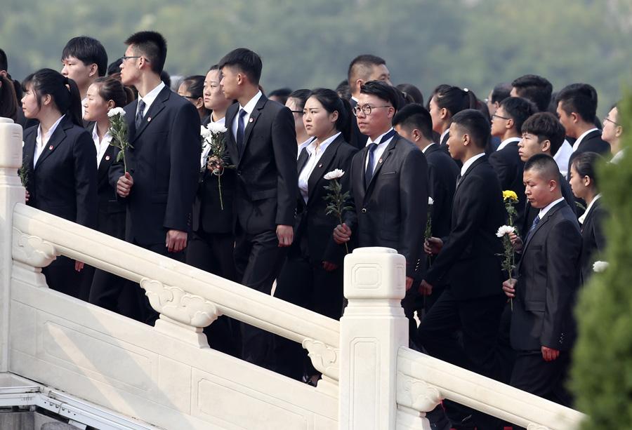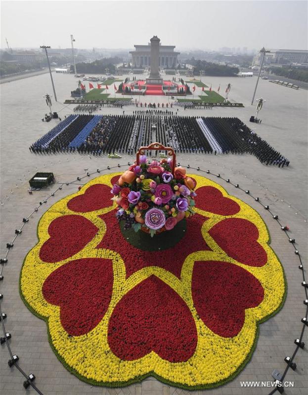 A ceremony is held to present flowers to the people's heroes at the Tiananmen Square in Beijing, capital of China, Sept. 30, 2017, to honor and remember deceased national heroes on the Martyrs' Day. (Xinhua/Yan Yan)