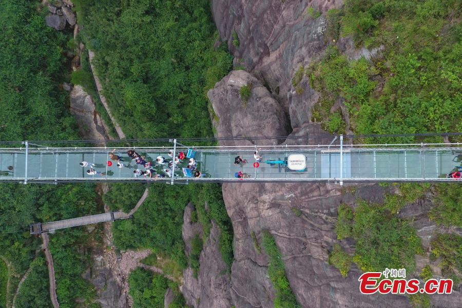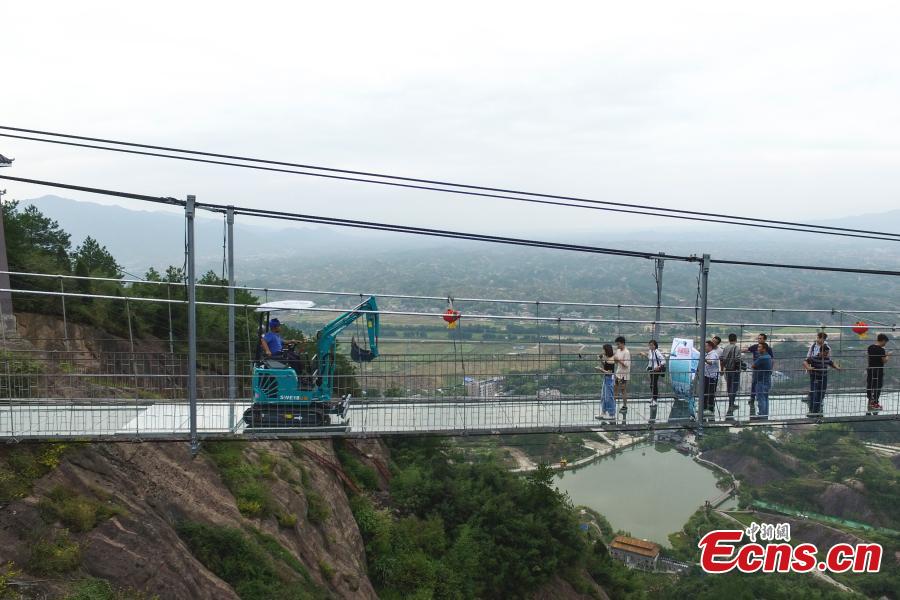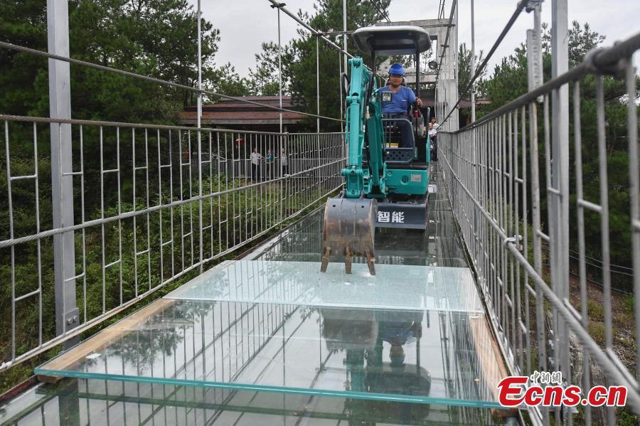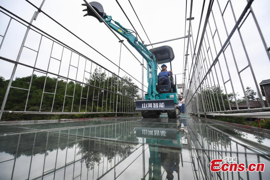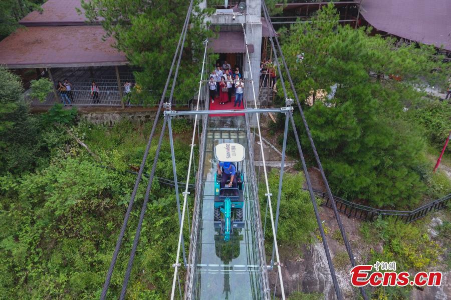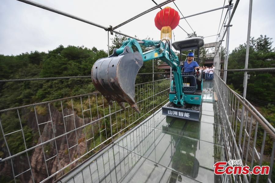 A man drives an excavator on a glass walkway, suspended 180 meters in the air, during a bearing test in the Shiniuzhai National Geological Park in Pingjiang County, Central China’s Hunan Province, Sept. 29, 2017. Authorities at the park are preparing for peak tourist numbers during the National Day holiday from Oct. 1 to 8. (Photo: China News Service/Yang Huafeng)