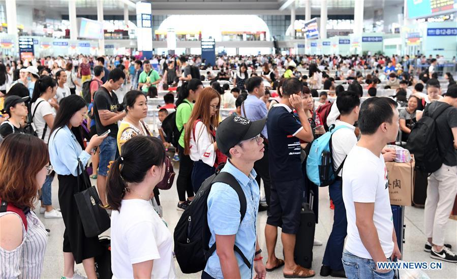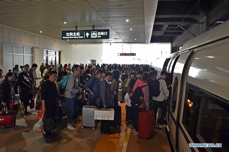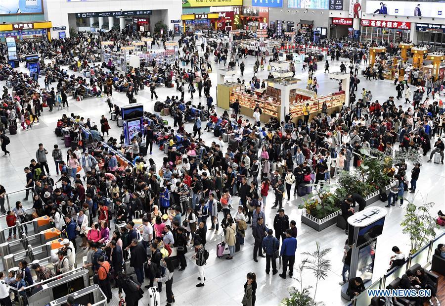 Passengers queue to have tickets checked at the Chongqing North Railway Station in Chongqing, southwest China, Oct. 1, 2017. Many parts of China witnessed a travel peak on the first day of the National Day holiday. (Xinhua/Wang Quanchao)