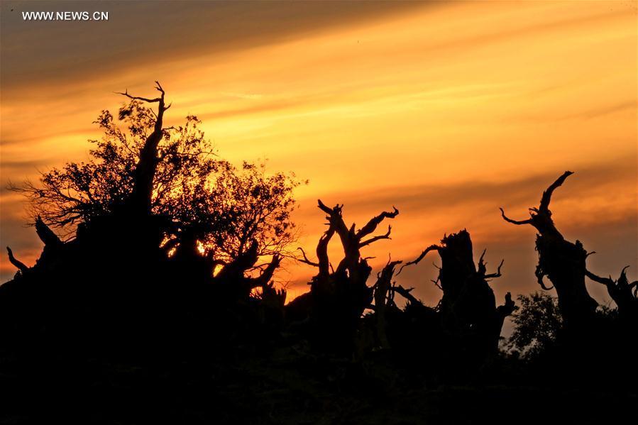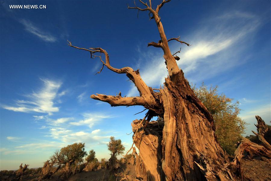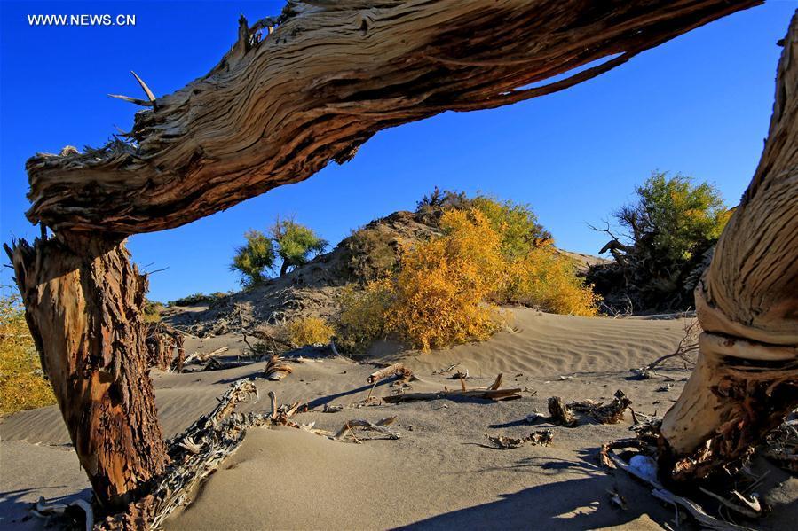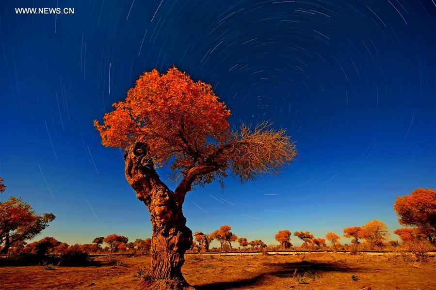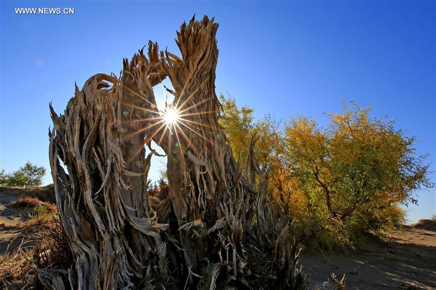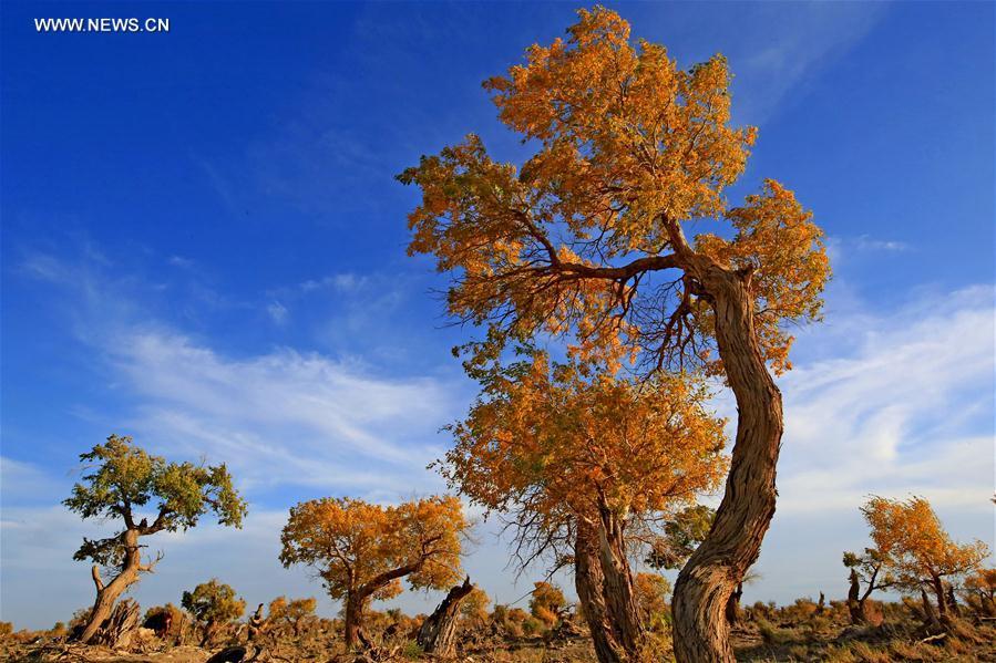 Populus diversifolia trees are seen at Yiwu County of Hami, northwest China's Xinjiang Uygur Autonomous Region, Oct. 1, 2017. Autumn is the best season in China to enjoy the golden colour of the populus diversifolia trees. (Xinhua/Cai Zengle)