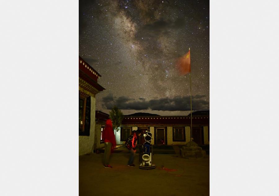 Xiao Bei, a tour guide in Southwest China's Tibet autonomous region, takes out his mobile phone and opens an app of star charts to find where the Milky Way will appear. Then he takes his tour group to the best place to set up their cameras, waiting for the stars over the Himalayas.