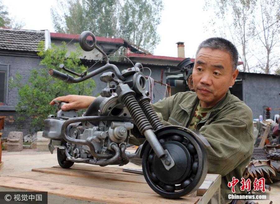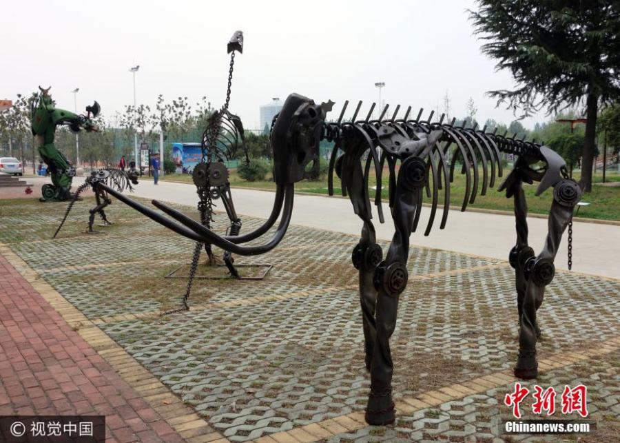 "Iron Men," produced from discarded motorcycles, spare auto parts, gas tanks and scrap iron, stand several meters tall in the city of Zoucheng, Shandong Province, October 8, 2017. The creator of the metal works is retired technician Liu Konghua. Without any pre-planning, the talented retiree draws his artistic inspiration from the scrap he collects, transforming an abandoned exhaust pipe into the "Iron Men's" muscle and old vehicle wheels into the "Iron Men's" joints. (Photo/VCG)