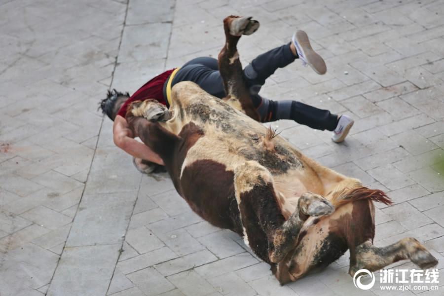 Crowd are shouting and cheering for the bullfighter who threw down a bull at Linggongtang Park in Jiaxing, east China's Zhejiang Province, Oct.8, 2017. (Photo/zjol.com.cn)