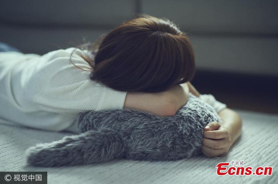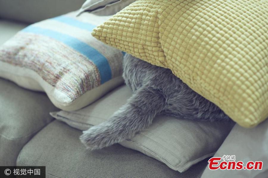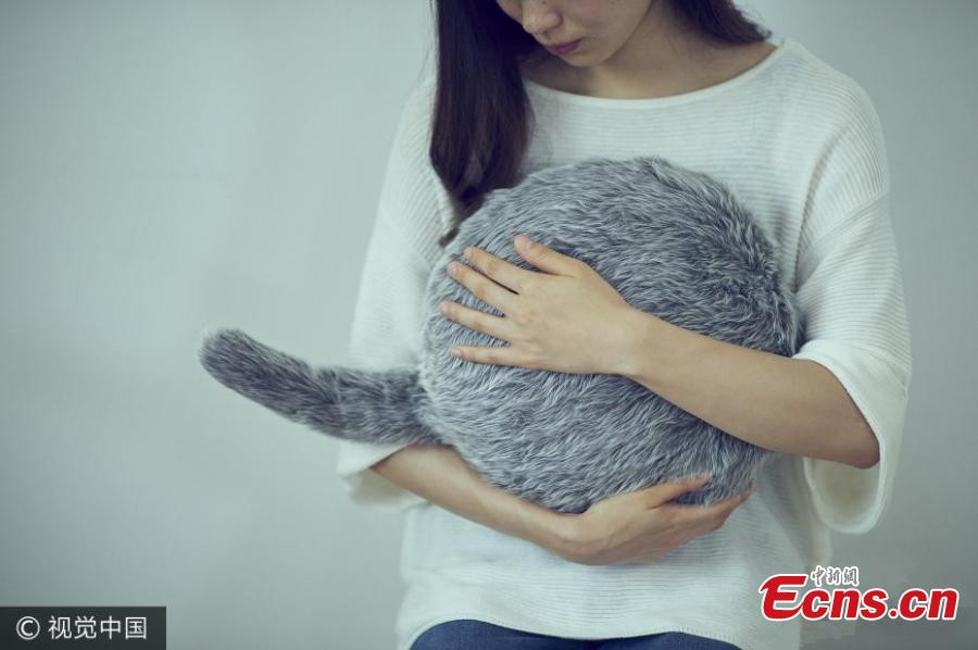 A demonstration of the therapy robot Qoobo by the Japanese company Yukai Engineering. The soft, round cushion has a robotic tail that reacts to strokes just as a loving pet would. (Photo/VCG)