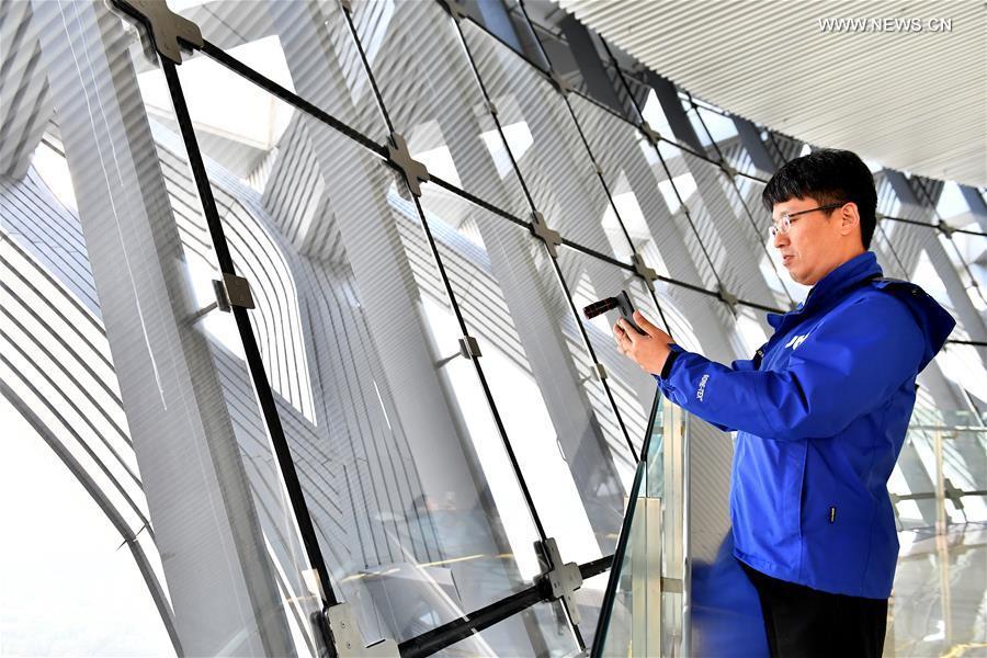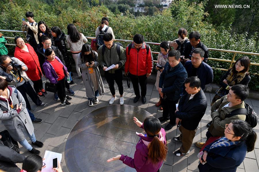 Song Kai (L, 2nd Row), Deputy Director of Jingshan Park, introduces the Central Axis of Beijing to journalists in Beijing, capital of China, Oct. 12, 2017. The Press Center of the 19th National Congress of the Communist Party of China (CPC) organized a reporting tour along the Central Axis of Beijing on Thursday. Chinese and foreign reporters visited scenic attractions such as the Jingshan Park, Yongding Gate and the Olympic Tower. (Xinhua/Li Xin)